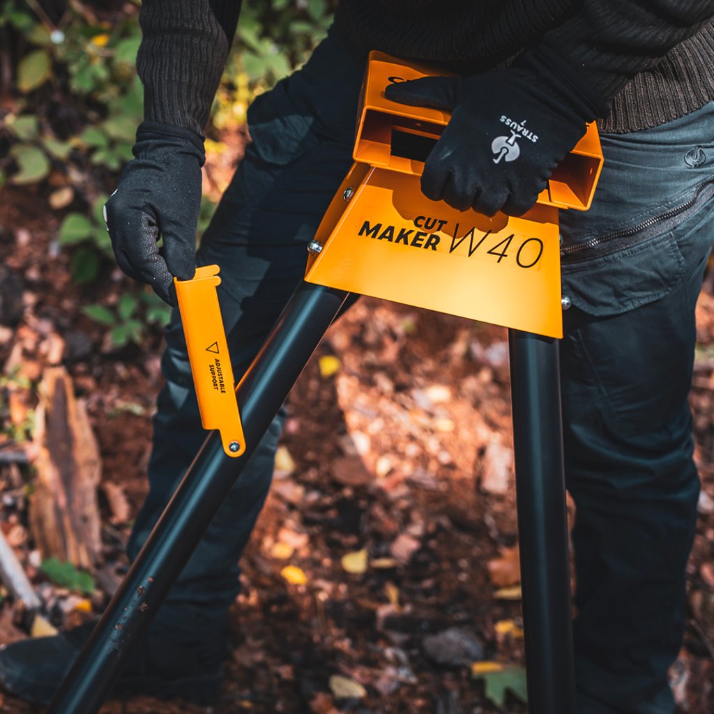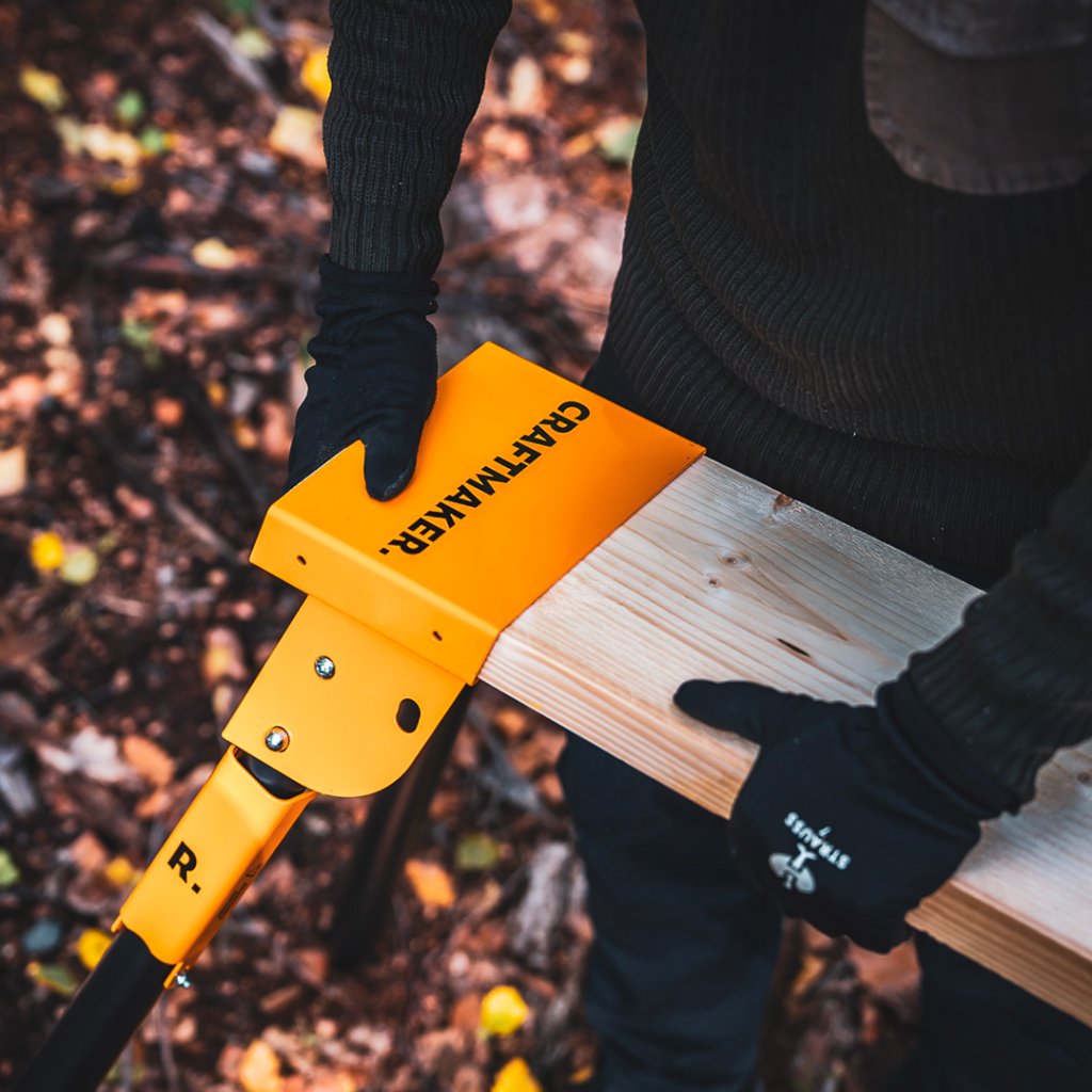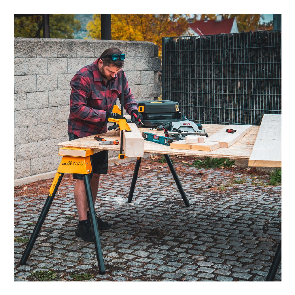 CRAFTMAKER Cut Maker W40 is a robust steel sawhorse built for more than just wood cutting – all in CRAFTMAKER’s signature black and yellow style. Enjoy the flexibility to swap out the supporting plank, or adjust the spacing of the steel jaws, which can be moved easily thanks to their bolt-on design. Flip-out yellow material supports add even more convenience. Remove the steel jaws from the wooden base to turn the W40 into a temporary workbench or support stand of any length. Quick and easy to set up or fold down. A stable cutting horse, ideal for both professionals and DIYers.