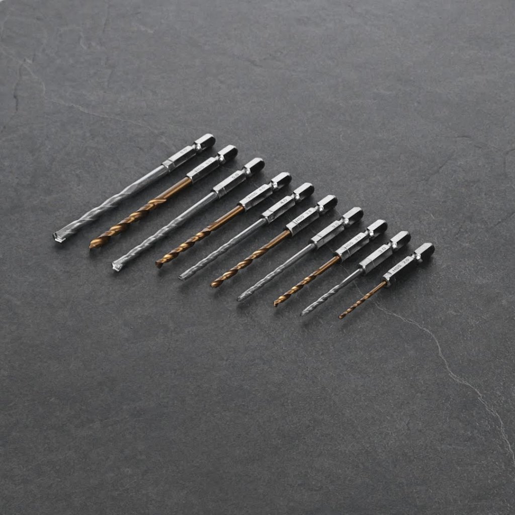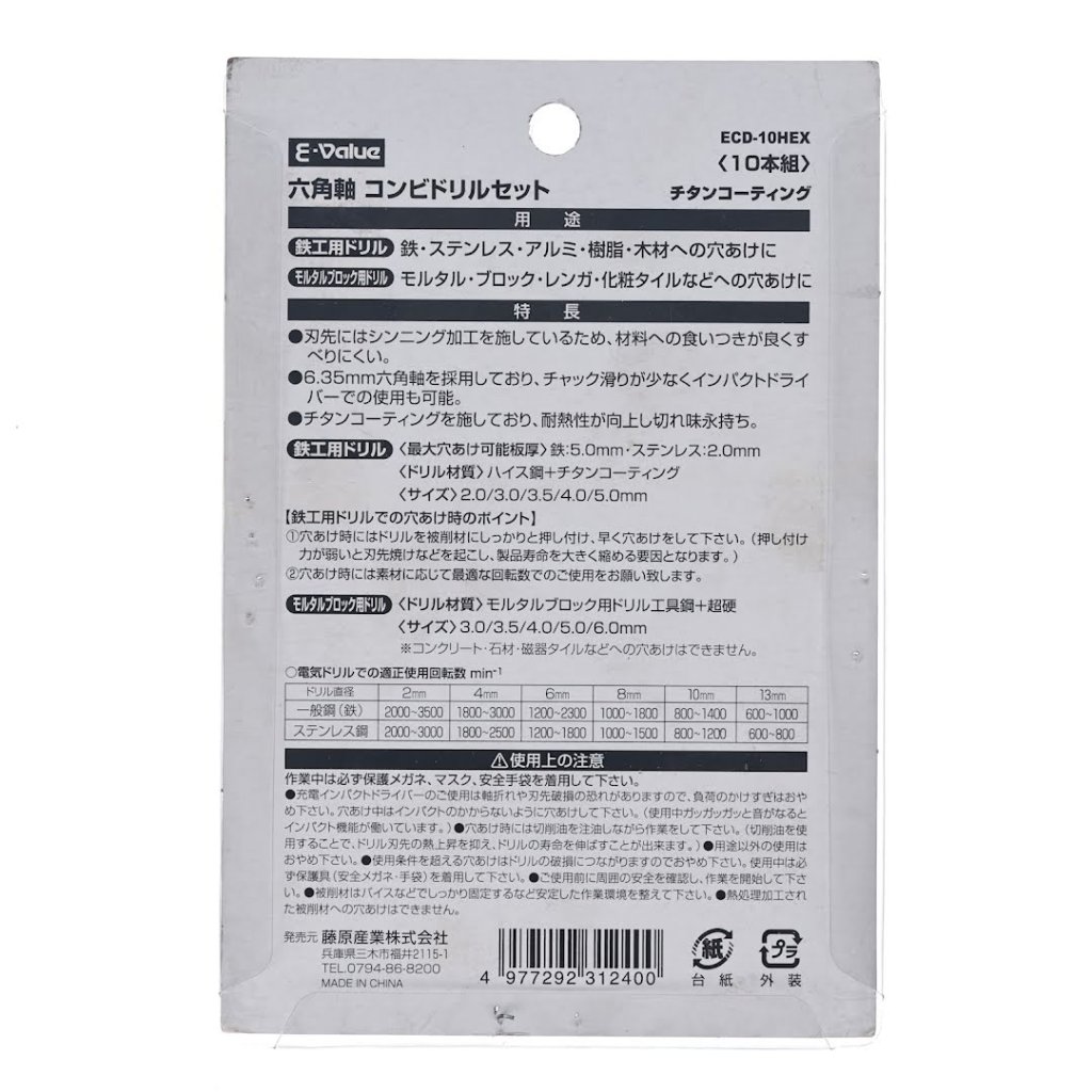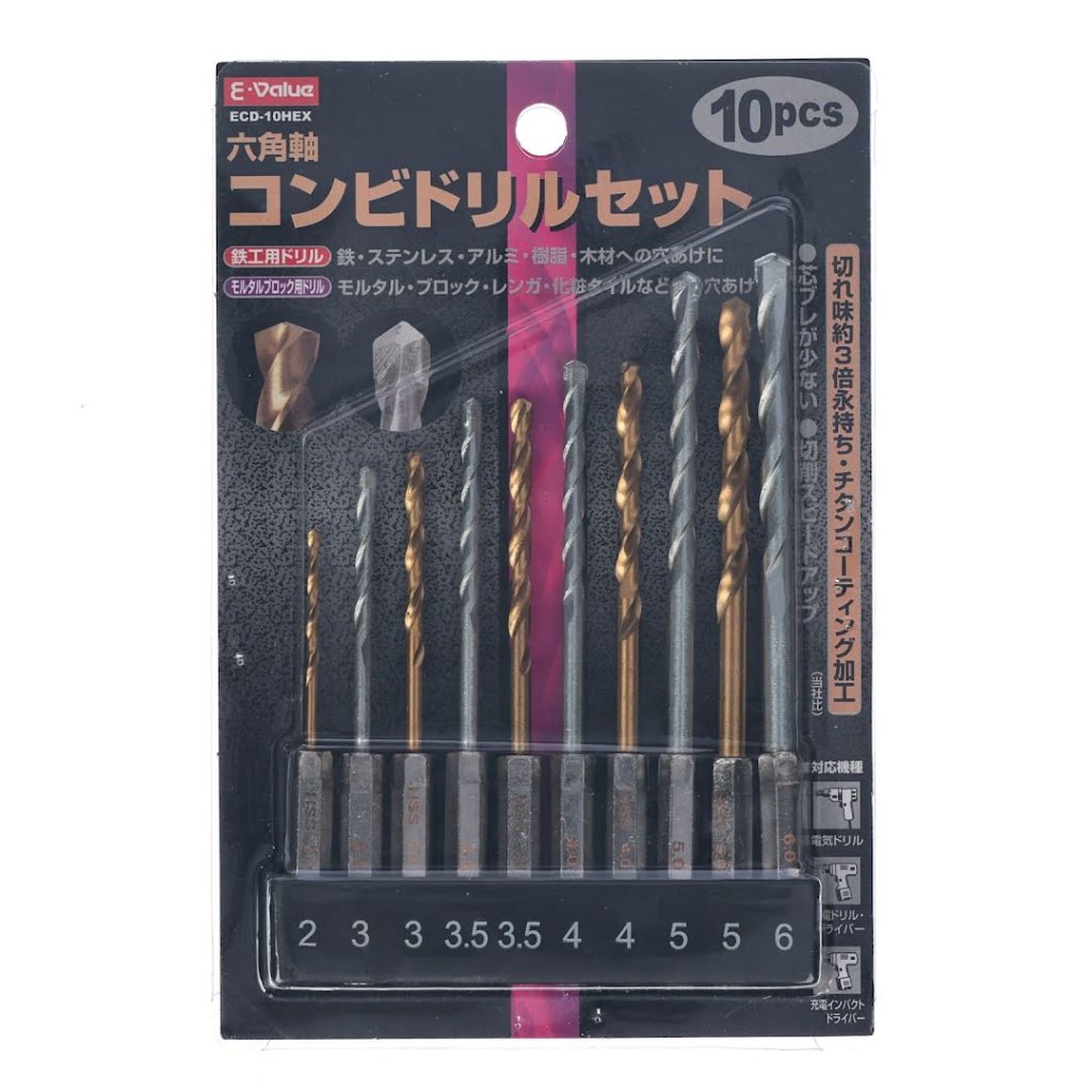 The E-VALUE 10-Piece Metal and Masonry Drill Bit Set, model ECD-10HEX, is a versatile combination set ideal for metalworking and masonry tasks. Featuring titanium-coated bits, this set ensures enhanced heat resistance and durability. The thinning process on the tips provides excellent material grip and reduces slippage. With a 6.35 mm hexagonal shank, these drills minimize chuck slippage and are compatible with impact drivers. The set includes ten pieces of various sizes, suitable for drilling into iron, stainless steel, aluminum, resin, wood, mortar, blocks, and bricks.