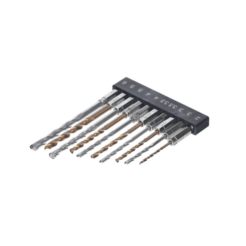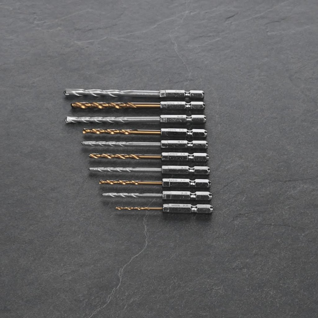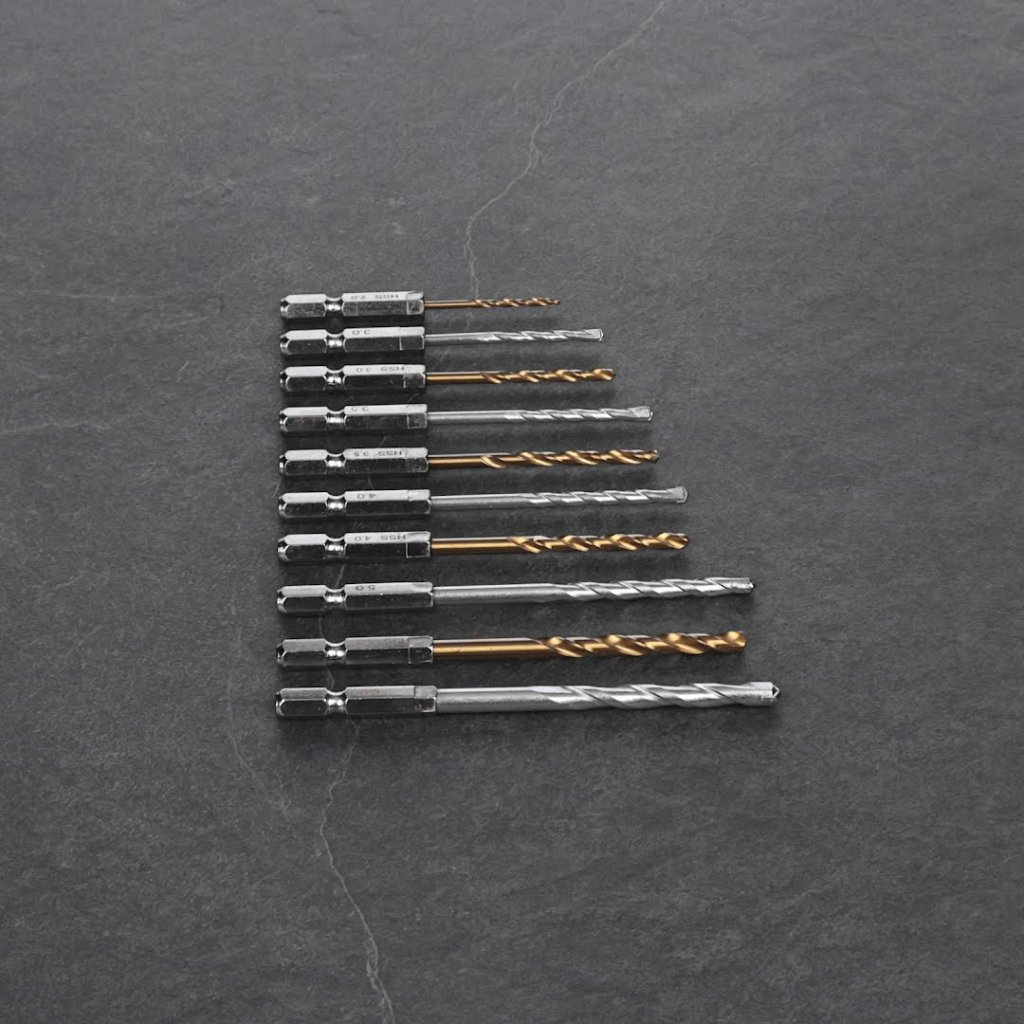 The E-VALUE 10-Piece Metal and Masonry Drill Bit Set, model ECD-10HEX, is a versatile combination set ideal for metalworking and masonry tasks. Featuring titanium-coated bits, this set ensures enhanced heat resistance and durability. The thinning process on the tips provides excellent material grip and reduces slippage. With a 6.35 mm hexagonal shank, these drills minimize chuck slippage and are compatible with impact drivers. The set includes ten pieces of various sizes, suitable for drilling into iron, stainless steel, aluminum, resin, wood, mortar, blocks, and bricks.