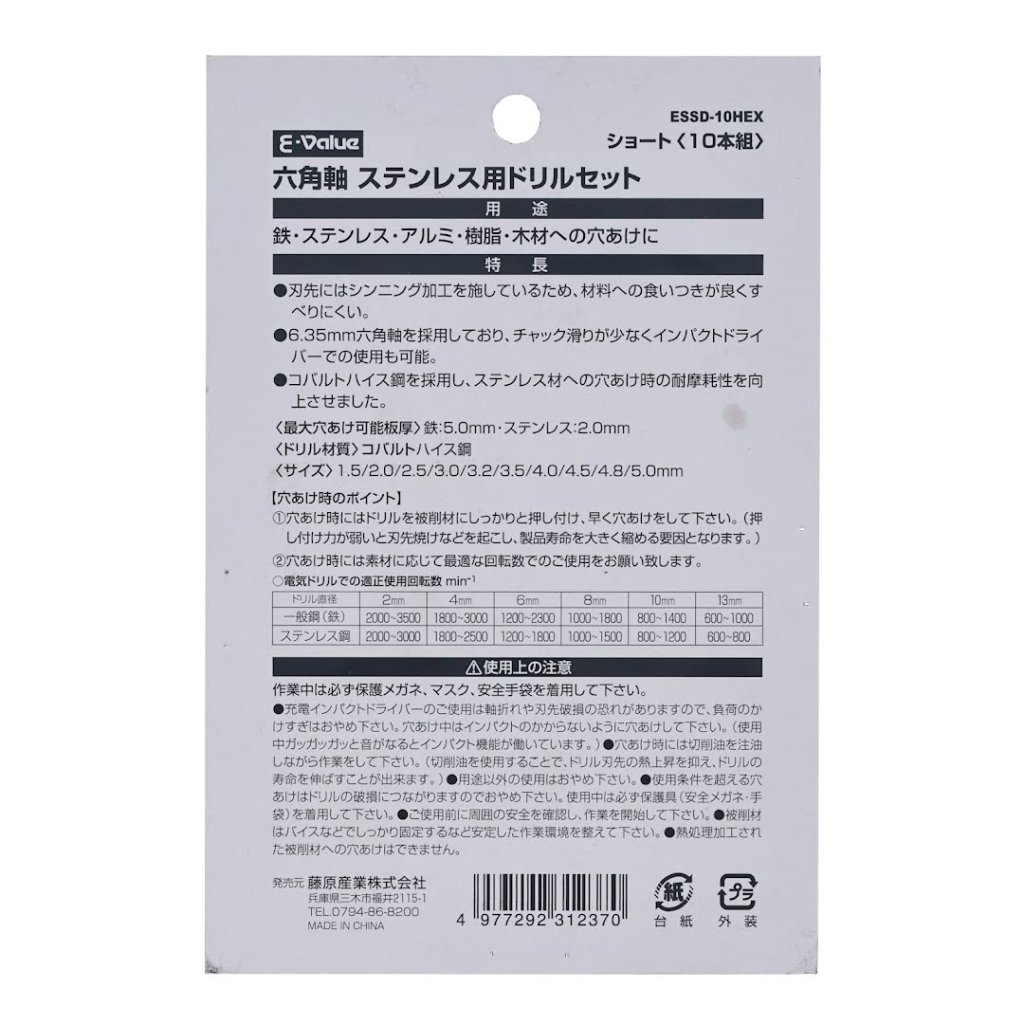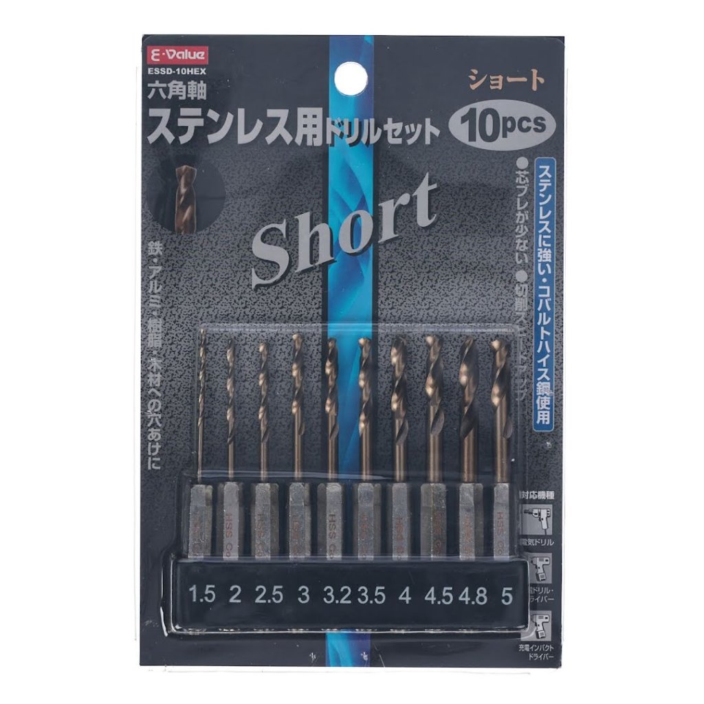 The E-VALUE 10-Piece Stubby HSS-Co Drill Bit Set, model ESSD-10HEX, is expertly designed for drilling into iron, stainless steel, aluminum, resin, and wood. Made from cobalt high-speed steel, it offers enhanced heat resistance and durability, making it ideal for stainless steel applications. This set includes ten drill bits ranging from 1.5 mm to 5.0 mm, featuring a 6.35 mm hex shank for reduced chuck slippage and compatibility with impact drivers. The thinned tip ensures excellent grip and minimizes slippage during use.