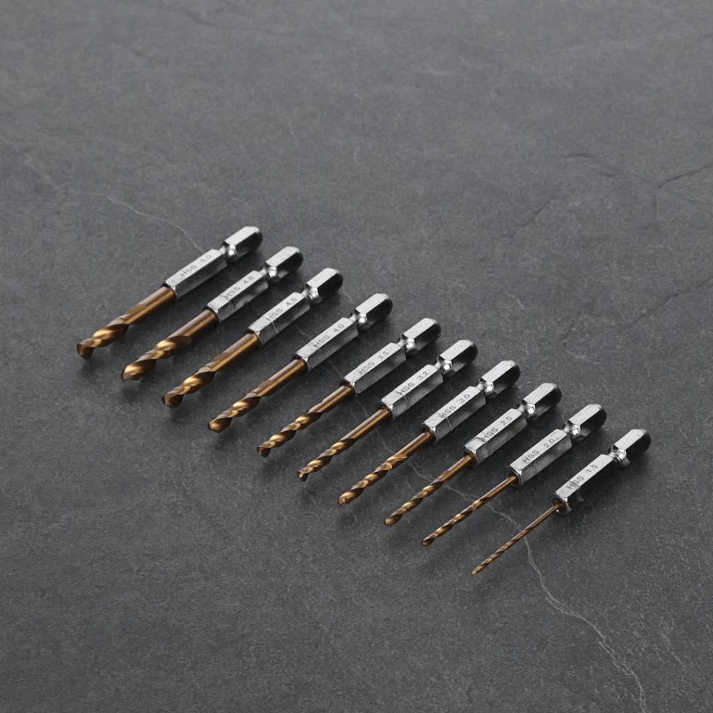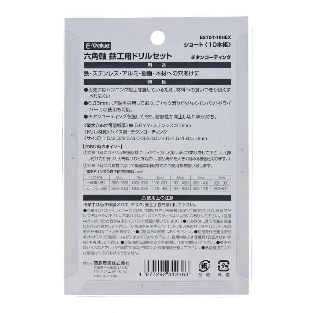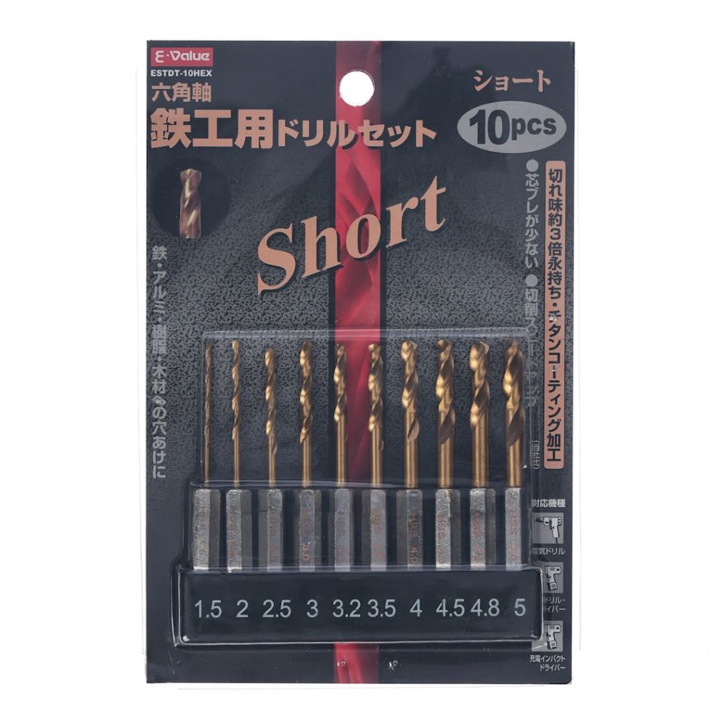The E-VALUE 10-Piece Stubby TiN-Coated Metal Drill Bit Set, model ESTDT-10HEX, is designed for versatile drilling tasks, including iron, stainless steel, aluminum, resin, and wood. This set of 10 drill bits ranges from 1.5 mm to 5.0 mm. Featuring a 6.35 mm hex shank, it ensures minimal chuck slippage and is compatible with impact drivers. The titanium coating enhances wear resistance and durability, ensuring long-lasting performance.