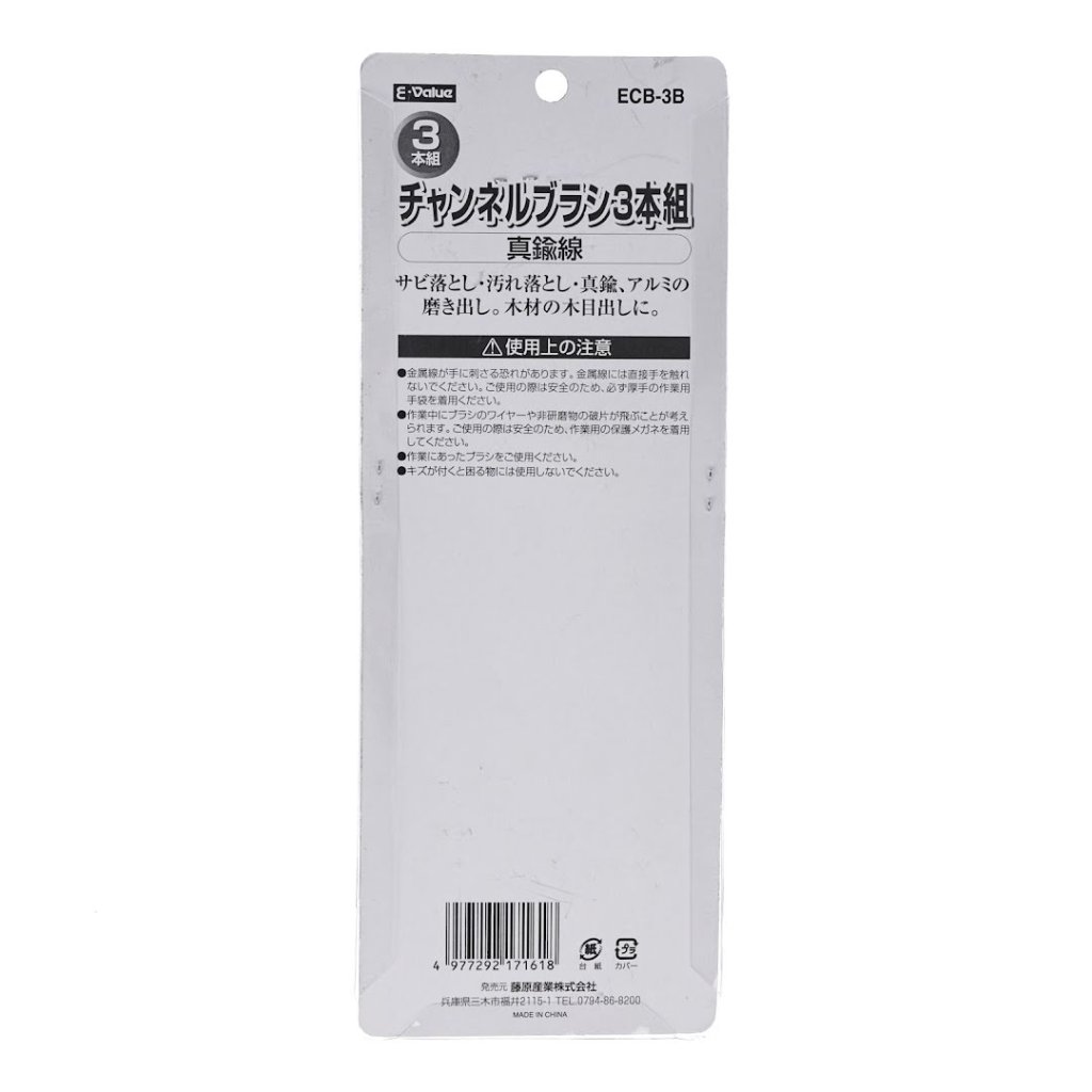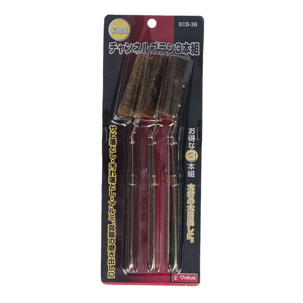 The E-VALUE 3-Piece Brass Channel Brush Set, model ECB-3B, is a versatile cleaning toolset for various applications. This set includes three brushes, each with brass bristles designed for rust and dirt removal, polishing aluminum and brass, and highlighting wood grain. Each brush measures 7 mm in width, 215 mm in height, and 30 mm in depth, with a total weight of 65 g.
