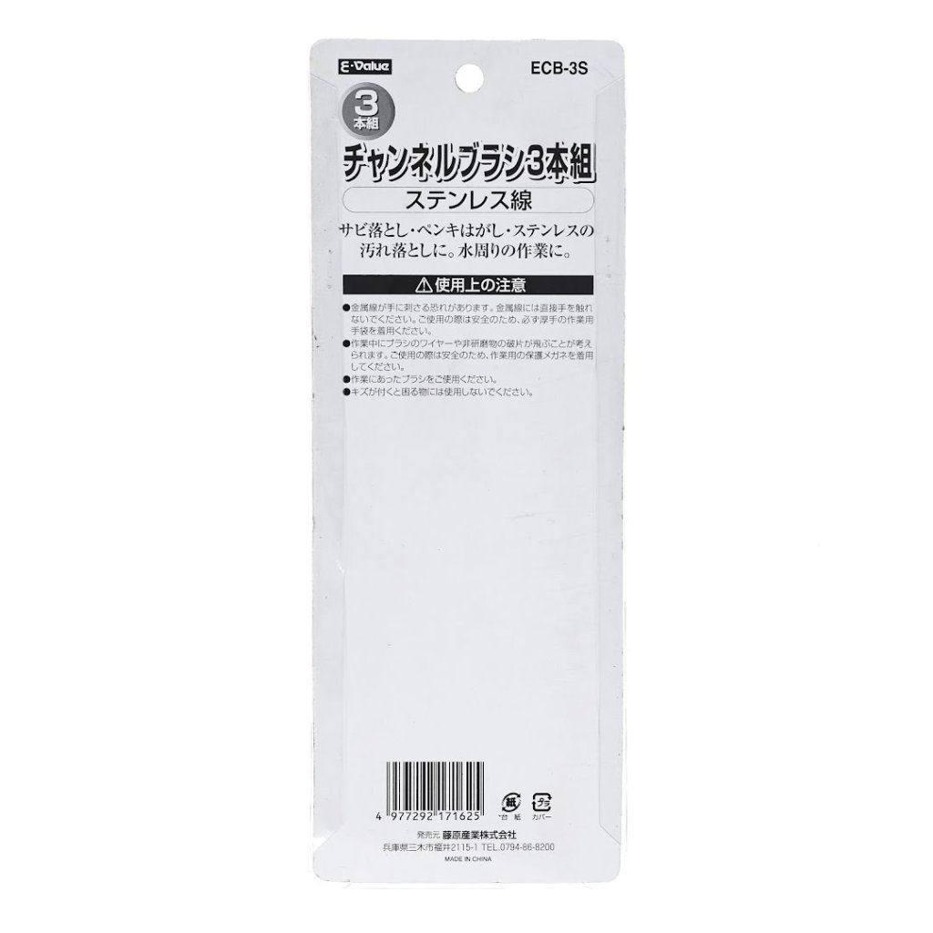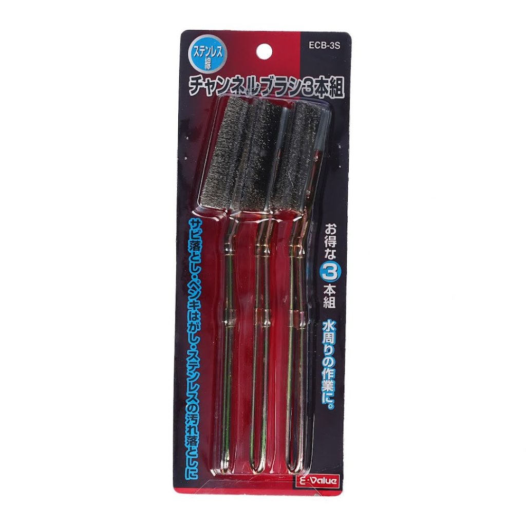 The E-VALUE 3-Piece Stainless Steel Channel Brush Set, model ECB-3S, is versatile for various cleaning tasks. It includes three durable stainless steel brushes, ideal for removing rust, paint, and dirt from stainless surfaces. Each brush measures 7 mm in width, 215 mm in height, and 30 mm in depth, with a total weight of 65 g. The stainless steel construction ensures the brushes are rust-resistant, making them suitable for wet environments.