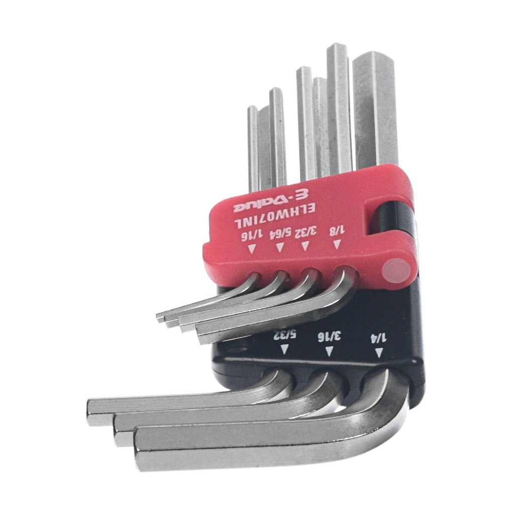 The E-VALUE 7-Piece Hex Key L-Wrench Set is a standard set featuring nickel-plated wrenches that are resistant to rust, making it a durable choice for any toolkit. This set has a convenient flip-open holder that simplifies carrying, storage, and access to each wrench. Designed for tightening and loosening hex socket bolts and screws, it includes sizes 1/16, 5/64, 3/32, 1/8, 5/32, 3/16, and 1/4 inches, catering to a wide range of needs. Its compact size, with dimensions of 47 mm width, 17 mm height, and 96 mm depth, and a weight of only 76 g, ensures it's easily portable for on-the-go tasks.