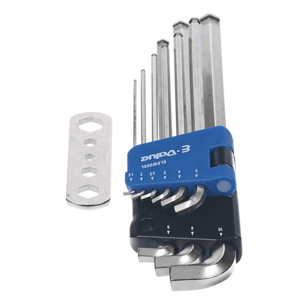 E-VALUE 9-Piece Hex Wrench Set with rust-resistant nickel plating, and sizes ranging from 1.5 mm to 6 mm. The set also comes with a flip-open holder.