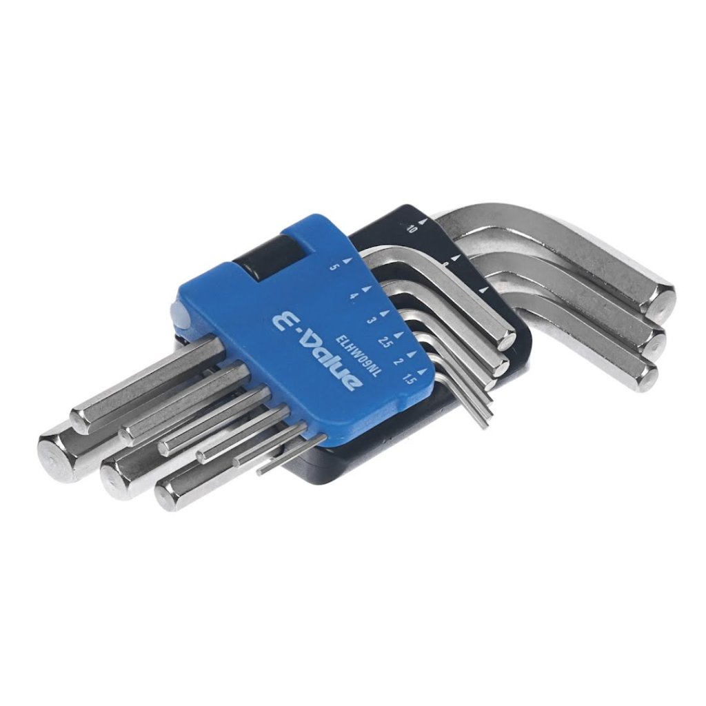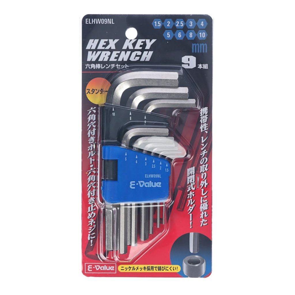 E-VALUE 9-Piece Hex Wrench Set with rust-resistant nickel plating, and sizes ranging from 1.5 mm to 6 mm. The set also comes with a flip-open holder.