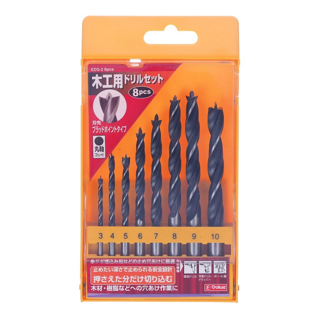 The E-VALUE 8-Piece Brad Point Drill Bit Set is designed for precision woodworking tasks, offering a reliable solution for drilling in wood and plywood. This set includes eight drill bits in sizes 3, 4, 5, 6, 7, 8, 9, and 10 mm, ensuring versatility for various project needs. Each bit features a brad point tip for easy drilling and optimal positioning, making them ideal for creating pilot holes. The drills come with a handy storage case for easy transportation and organization. For safety and optimal performance, it's essential to check the drill bits for damage before use, securely attach them, and wear protective eyewear during operation.