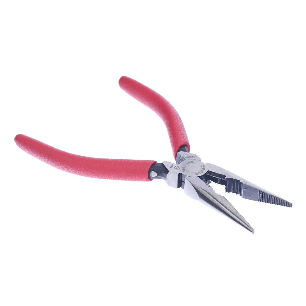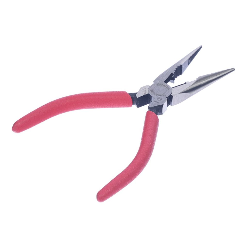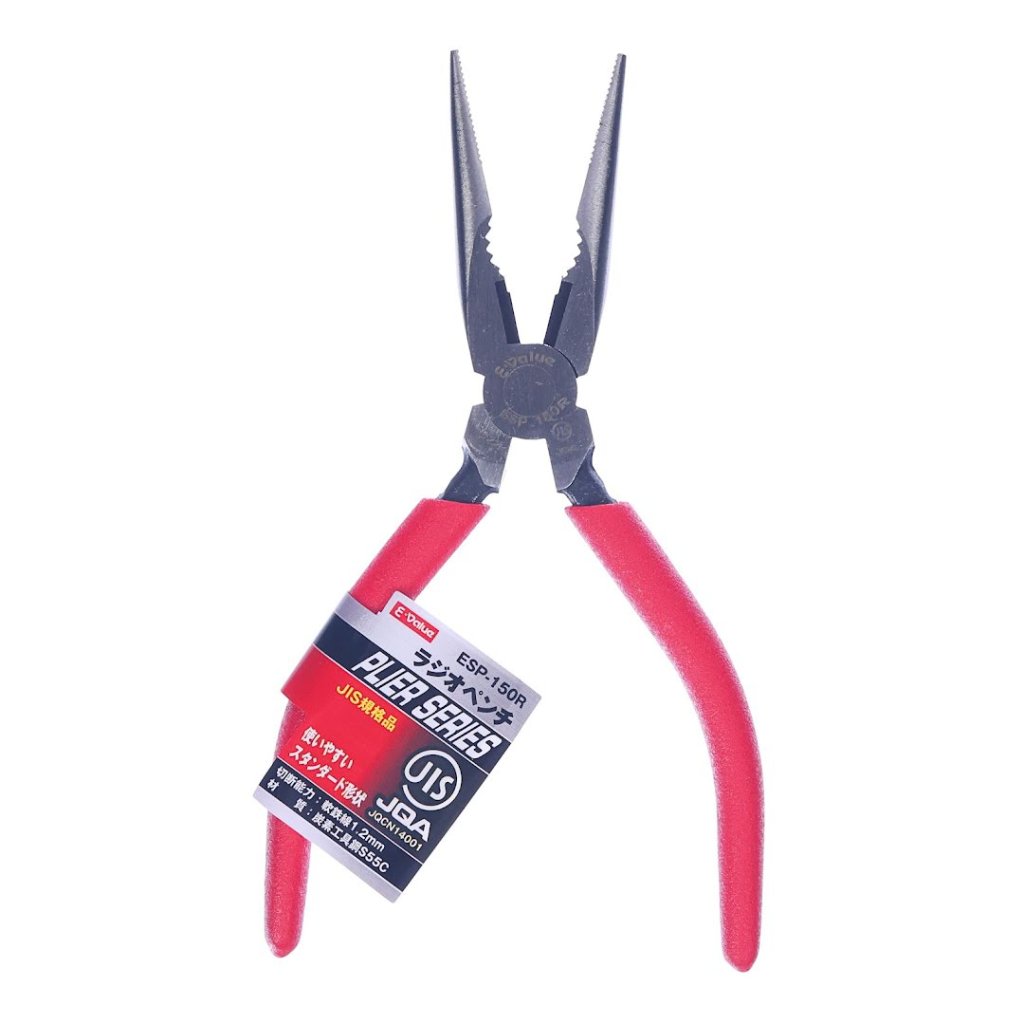 The E-VALUE Combination Pliers, model ESP-150R, is a versatile tool for precision tasks such as assembling delicate equipment and wiring. This tool is crafted for easy handling and maneuverability, measuring 165 mm in height, 50 mm in width, and weighing just 130 g. It meets the rigorous JIS standards, ensuring reliability and safety in use. With a cutting capacity of 1.2 mm for soft iron wire and a total length of 150 mm, it's an essential tool for professionals and DIY enthusiasts.