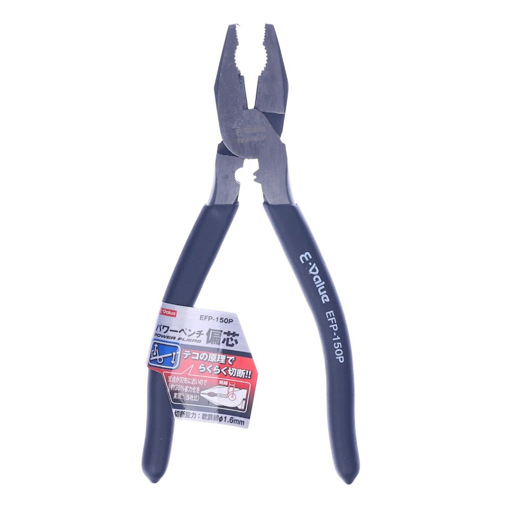 The E-VALUE High Leverage Combination Pliers, EFP-150P, is designed for ease and efficiency in cutting tasks. This versatile tool allows for twisting, cutting, gripping, and bending with minimal effort, thanks to its design that positions the fulcrum close to the blades, reducing the required force by approximately 30%. It boasts a cutting capacity for soft iron wire up to 1.6 mm in diameter and blade hardness rated at HRC 55-62, ensuring durability and precision in every cut. With dimensions of 50 mm in width, 165 mm in height, and 13 mm in depth, and weighing just 200 g, it's crafted for both comfort and performance in soft steel wire cutting tasks.