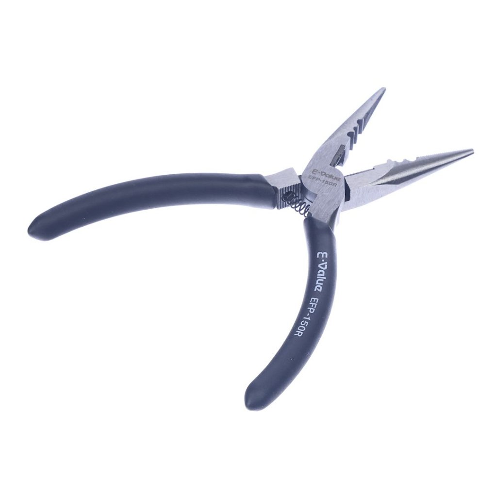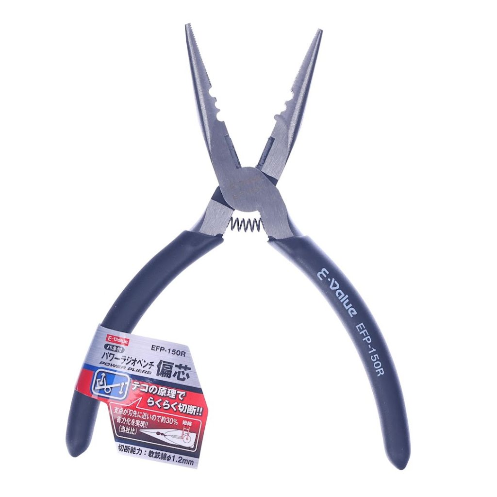 The E-VALUE High Leverage Needle-Nose Combination Pliers, model EFP-150R, are designed for ease and precision in your detailed assembly and wiring tasks. Engineered with a pivot close to the blades, it allows for cutting with approximately 30% less effort than standard pliers. It boasts a cutting capacity for soft iron wire up to 1.2 mm in diameter and a blade hardness of HRC 55-62, ensuring durability and sharpness. Additionally, its spring-loaded mechanism enhances ease of use. This tool combines portability with power, measuring 53 mm in width, 160 mm in height, and 15 mm in depth and weighing just 140 g.