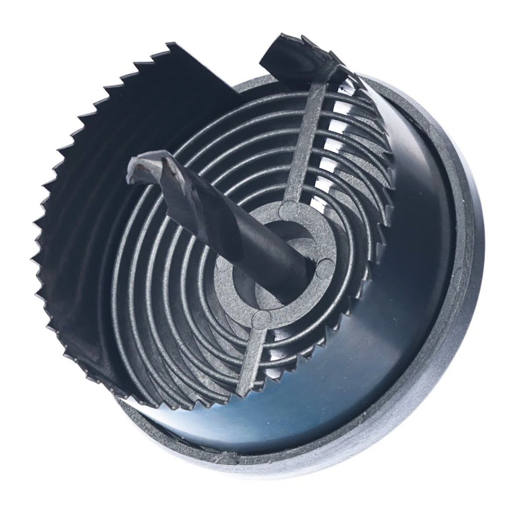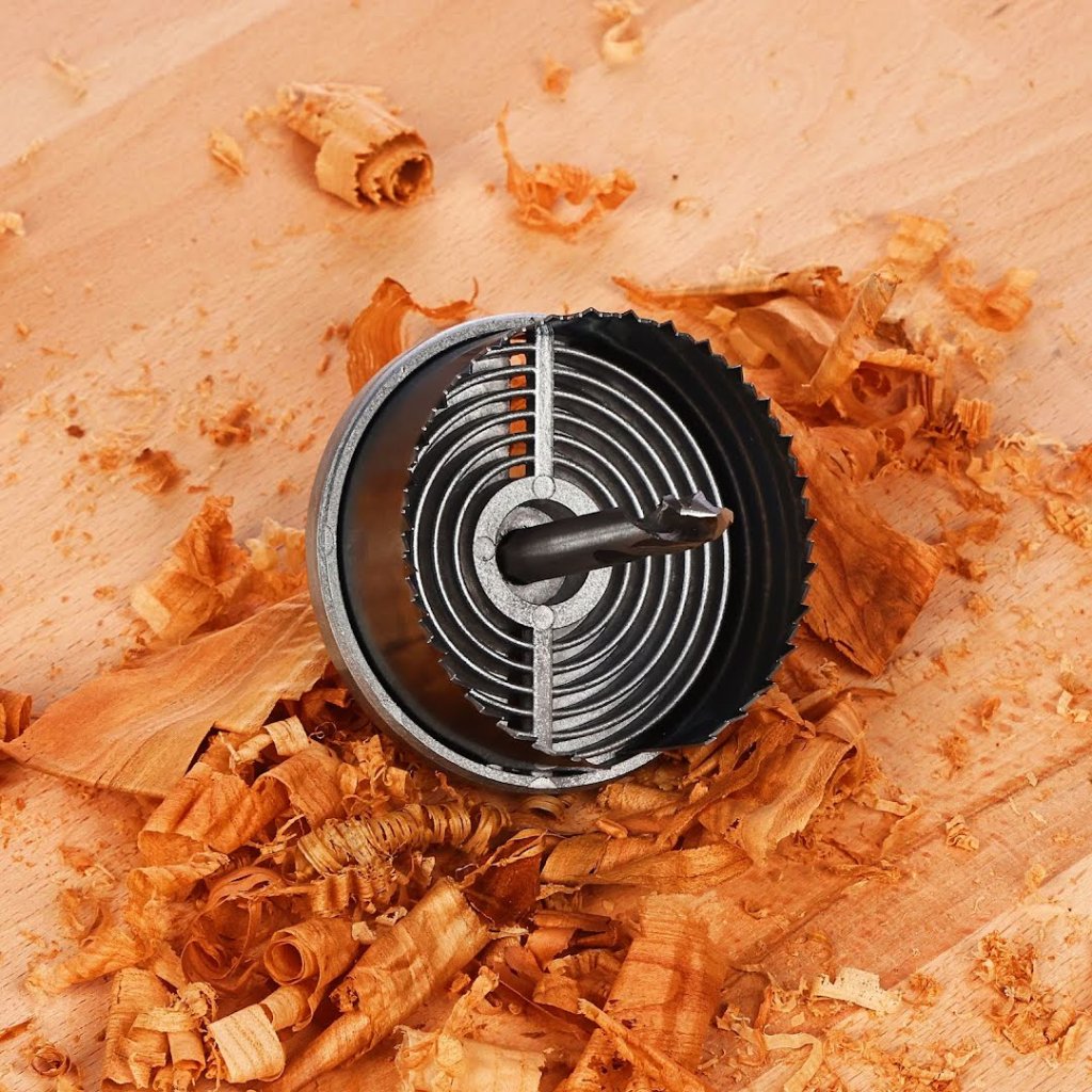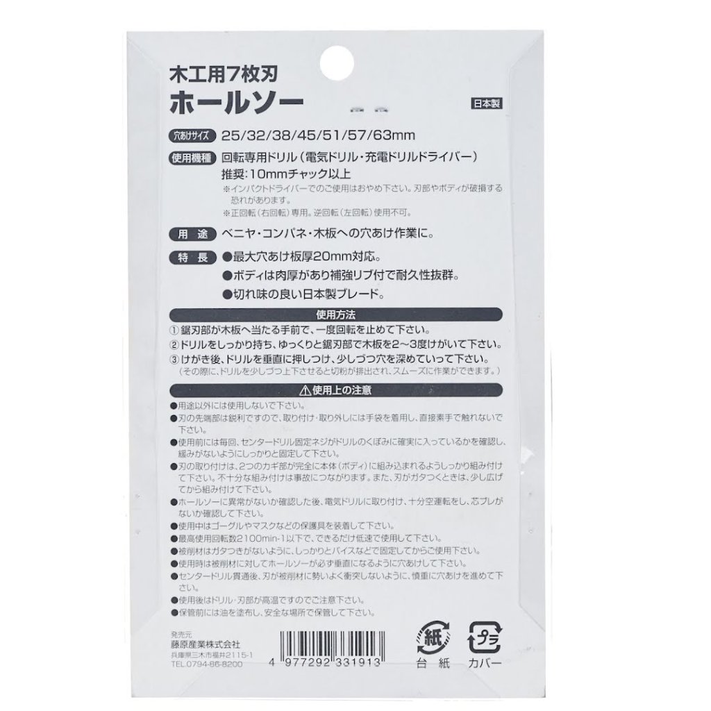 The E-VALUE Japanese 7-Piece Hole Saw Kit is designed for drilling holes in plywood, particle board, and wood planks. This kit includes seven blades with sizes ranging from 25 mm to 63 mm. The thick body and reinforced ribs ensure exceptional durability, while the Japanese-made blades provide excellent cutting performance. It is suitable for electric and battery-operated drills with a 10 mm or larger chuck.