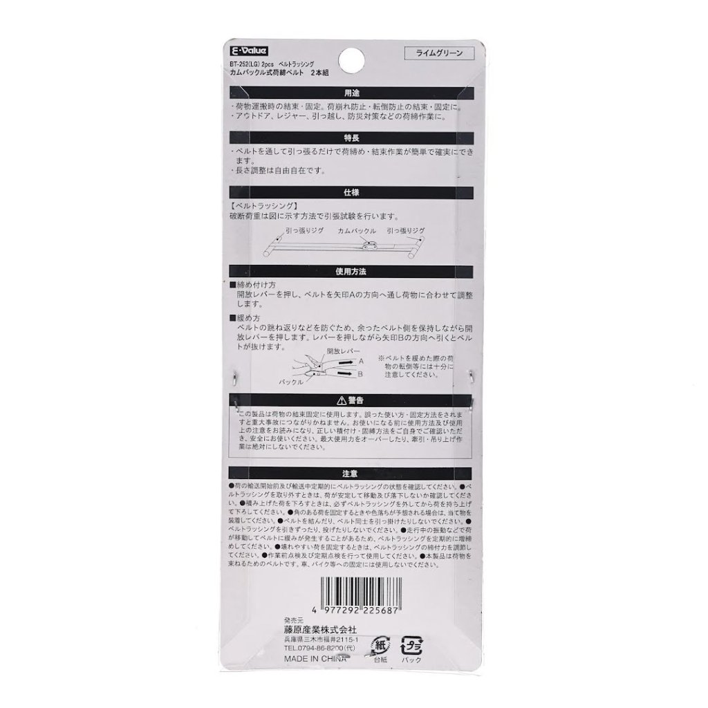 The E-VALUE Lashing Strap makes securing and bundling tasks simple and reliable. It is ideal for preventing cargo shifting and falling during transport and features a cam buckle for easy tightening. With a belt width of 25 mm and a length of 2 m, this lime green strap is perfect for outdoor activities, moving, and disaster prevention. The set includes two straps.