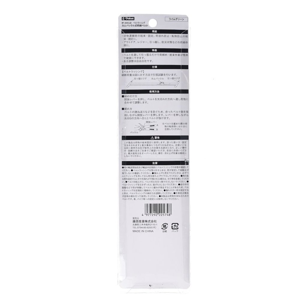 The E-VALUE Lashing Strap, with its cam buckle design, makes securing and bundling tasks simple and reliable. It is ideal for preventing cargo shifts during transport and is perfect for outdoor activities, moving, and disaster preparedness. The strap measures 25 mm in width and 6 m in length, with a maximum working load of 0.75 kN (76 kg) and a breaking load of 3 kN (305 kg).
