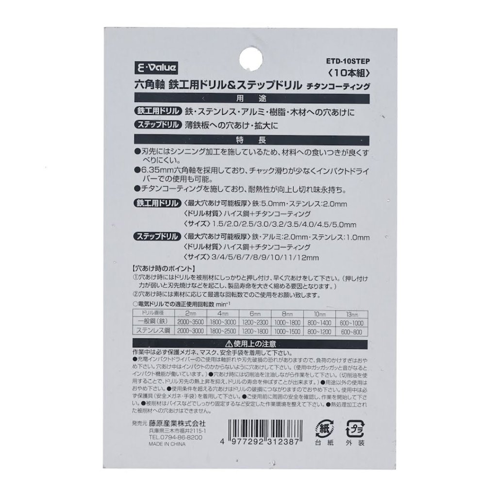 The E-VALUE Metal and Step Drill Bit Set, model ETD-10S, is a versatile drilling set for iron, stainless steel, aluminum, plastic, and wood. Featuring sharpened tips with thinning processing, these drills ensure excellent material penetration with minimal slippage. The set includes ten different sizes of metal drills (1.5 mm to 5.0 mm) and step drills (3 mm to 12 mm), all with a 6.35 mm hexagonal shaft for reduced chuck slippage and compatibility with impact drivers. Additionally, the titanium coating enhances heat resistance and maintains sharpness for prolonged use.