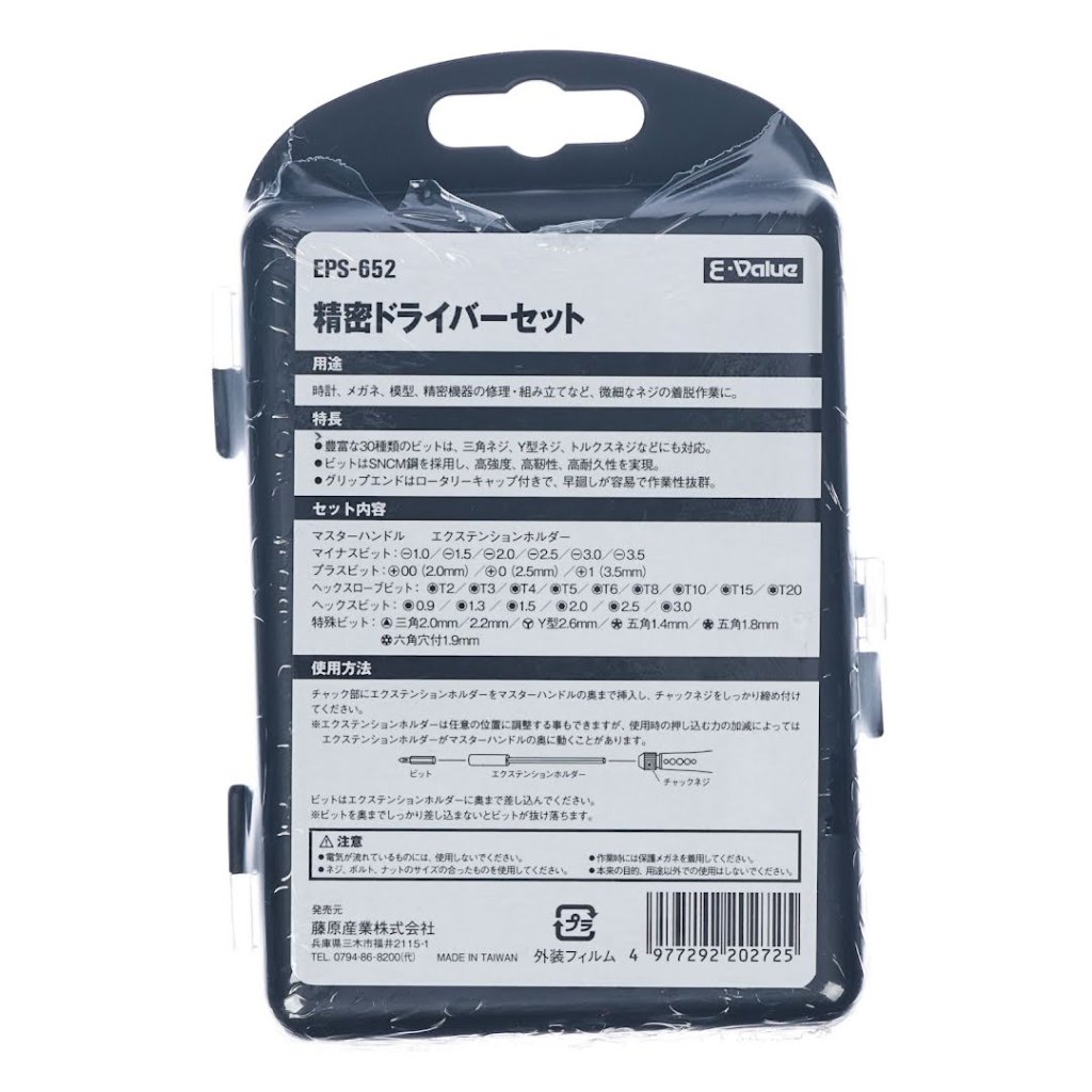 The E-VALUE Precision Screwdriver Set, model EPS-652, is ideal for repairing watches, glasses, and other precision instruments. This set includes 30 types of bits that accommodate various screws, such as triangle, Y-type, and Torx. It features a rotary cap on the handle for easy and efficient turning. The included extension holder allows an adjustable shaft length of 40 to 110 mm. The bits are made from durable SNCM steel, ensuring high strength, toughness, and durability.