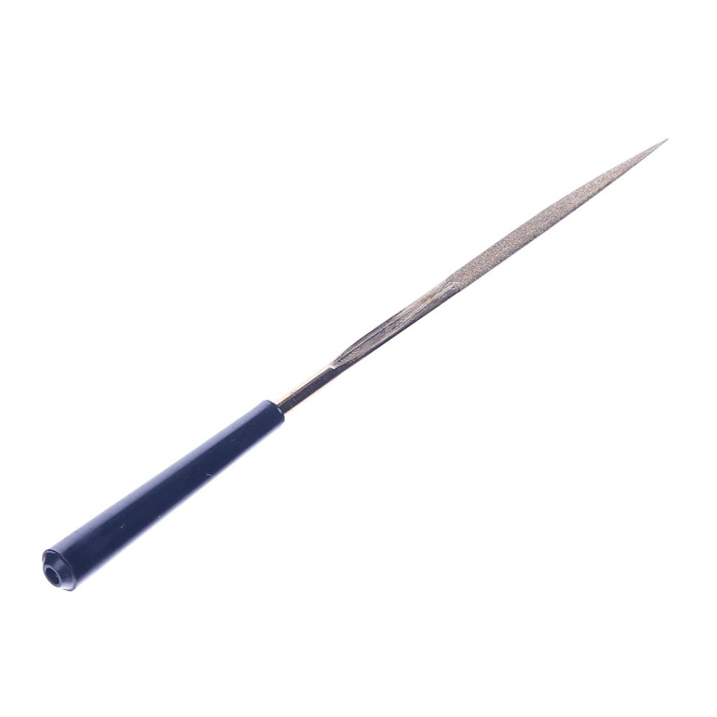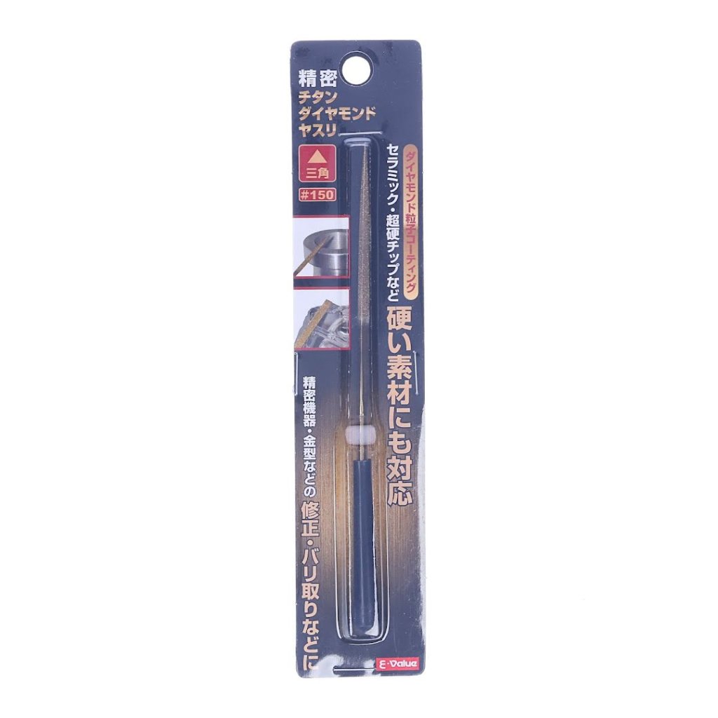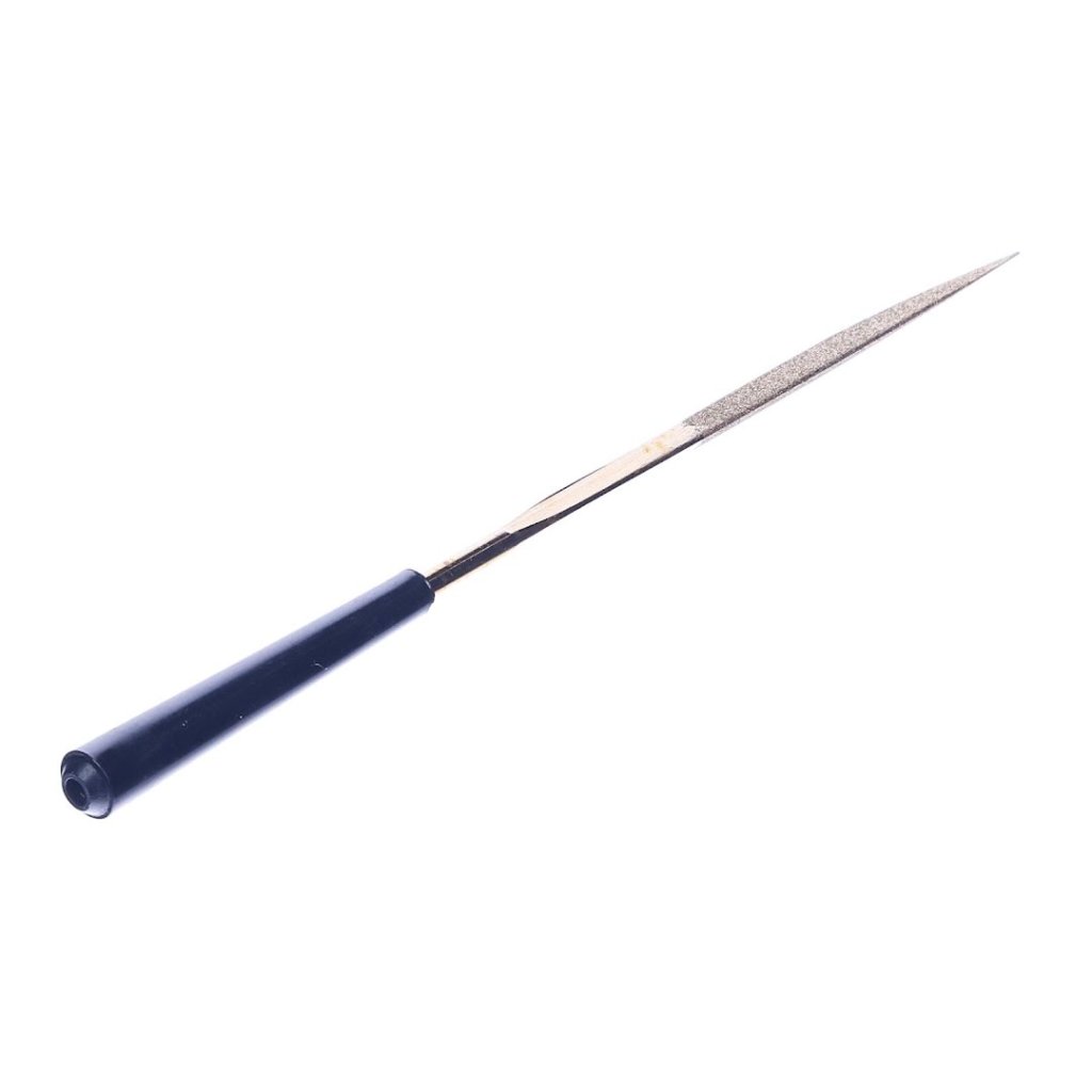 The E-VALUE Precision Titanium Diamond Needle File is an essential tool for precision work, designed for finishing hard-to-cut materials, deburring precision machinery parts, and filing metal and plastic. This triangular-shaped diamond file is enhanced with diamond powder electroplated onto the base material, minimizing clogging. The titanium coating improves the retention of diamond particles on the surface, allowing for efficient filing in any direction without excessive pressure. The file is also treated with a plating process for rust prevention, ensuring durability. With a size of 7.7 mm width, 43 mm height, and 7.7 mm depth, and weighing only 8 g, it's designed for ease of use and precision.