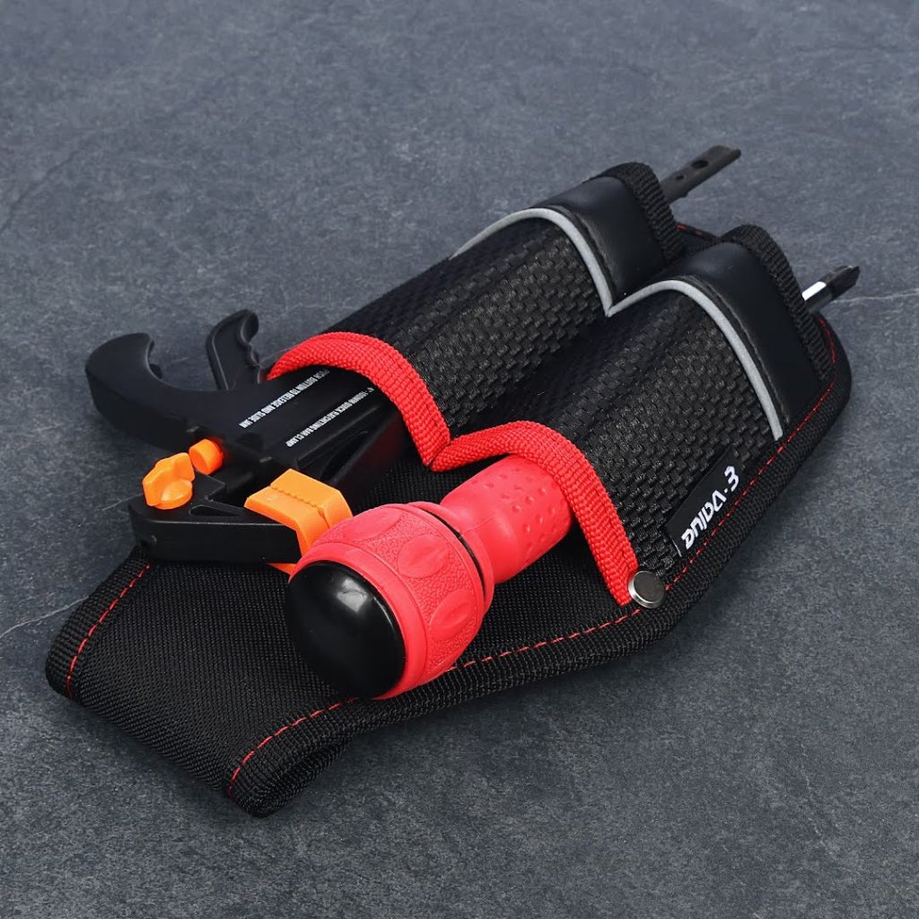 The E-VALUE Tool Case with 2 Pockets, model ETK-2T RD, is lightweight and durable, making it ideal for carrying pliers and other tools. Measuring 130 mm wide, 240 mm high, and 30 mm deep, this tool holder is compatible with belts up to 60 mm wide. The stylish black and red color scheme adds a touch of sophistication to your tool belt.