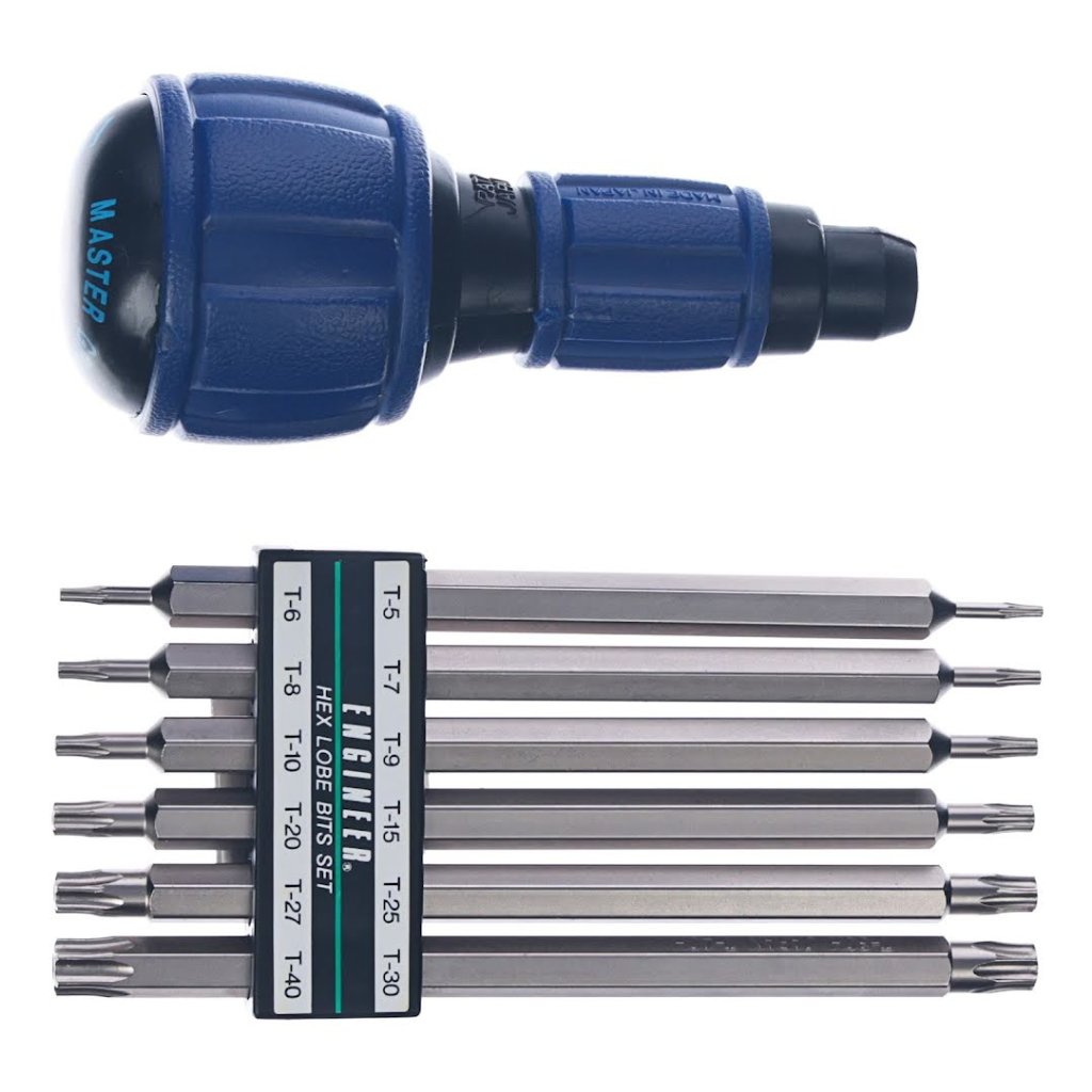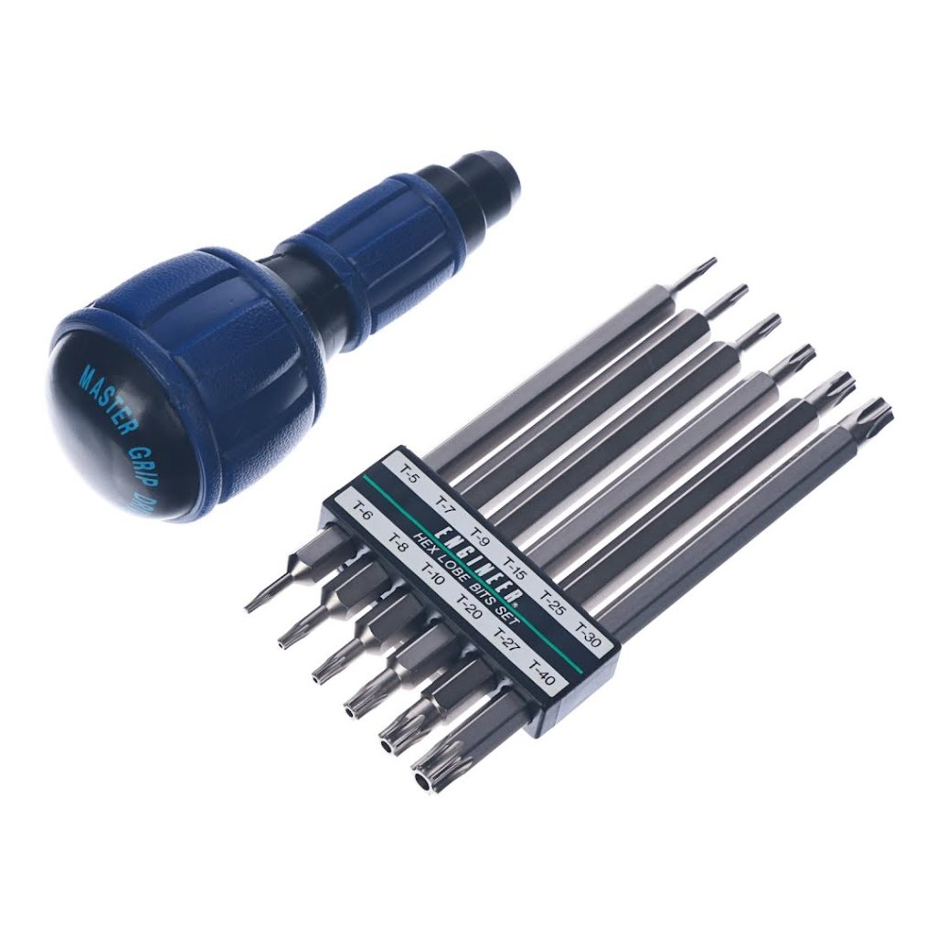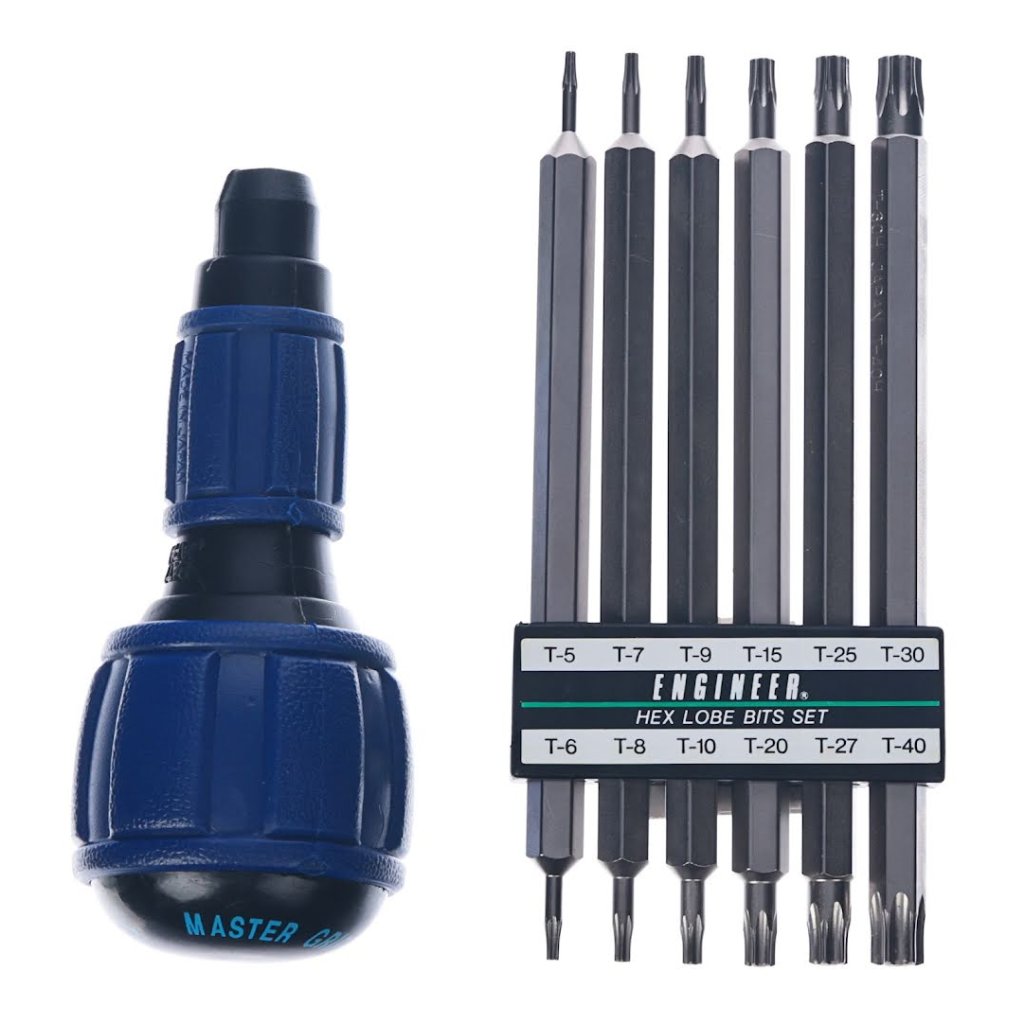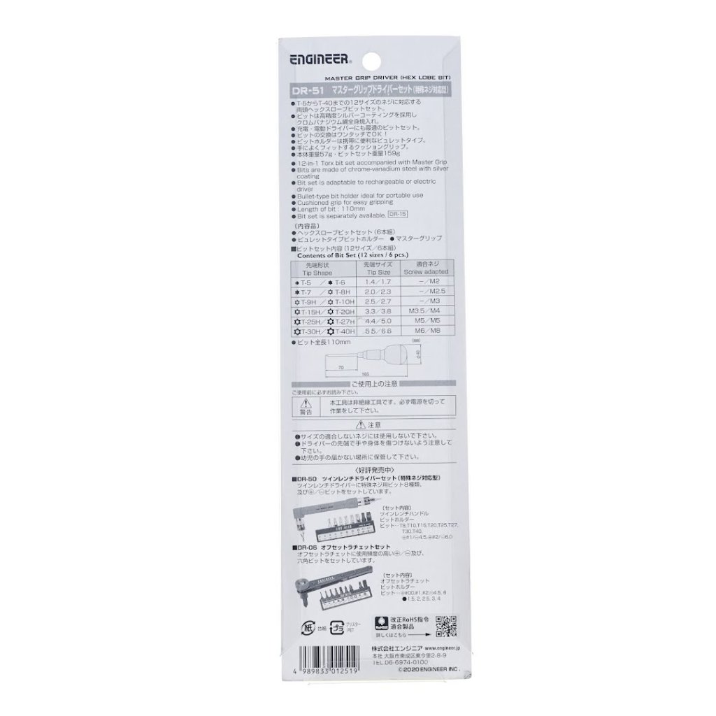 The ENGINEER Japanese Master Grip Screwdriver Set, model DR-51, is a versatile tool designed for working with specialized screws. It includes a set of 12 Torx bits ranging from T5 to T40, all featuring high-precision silver coating and made from chrome-vanadium steel. The tool also features a comfortable cushion grip that fits well in the hand, making it ideal for tightening and loosening tasks.