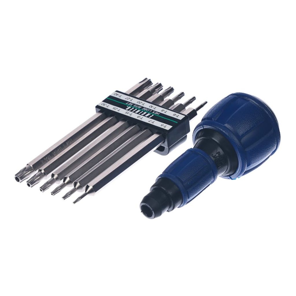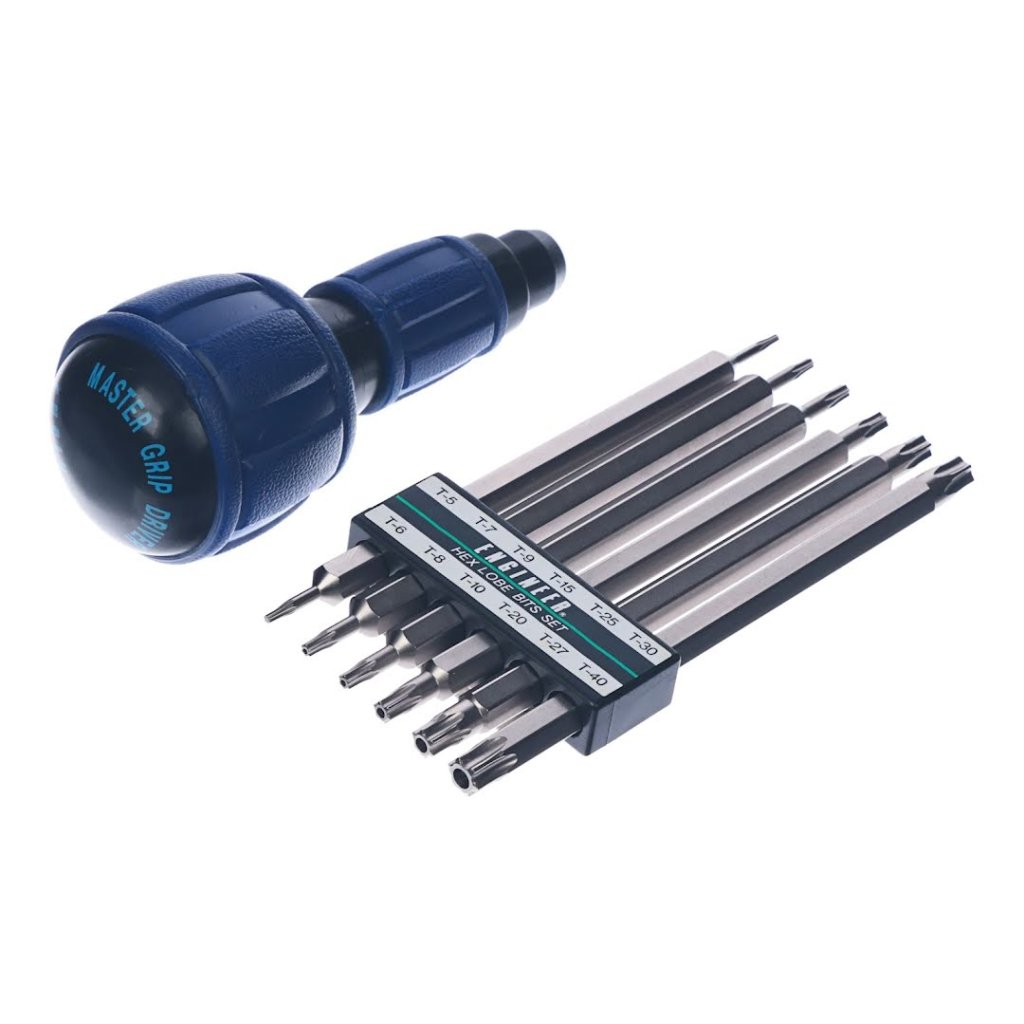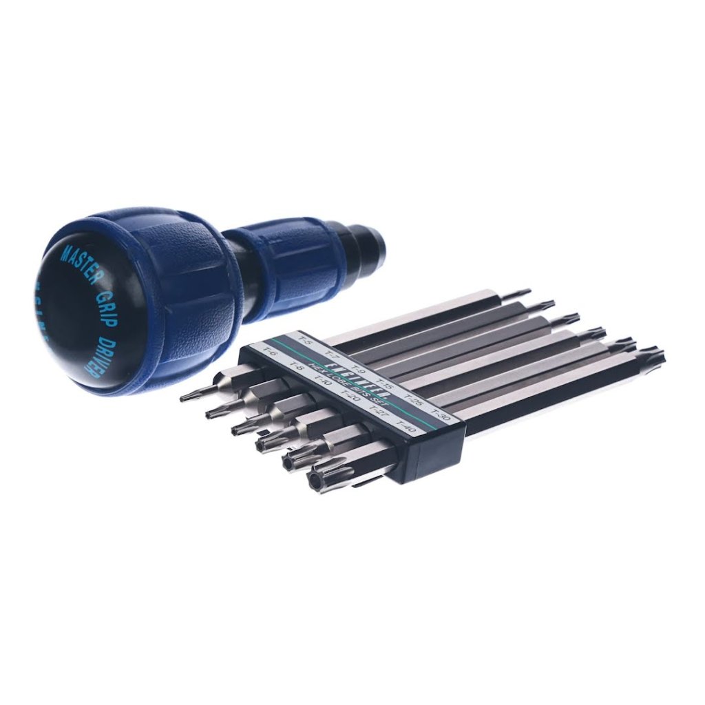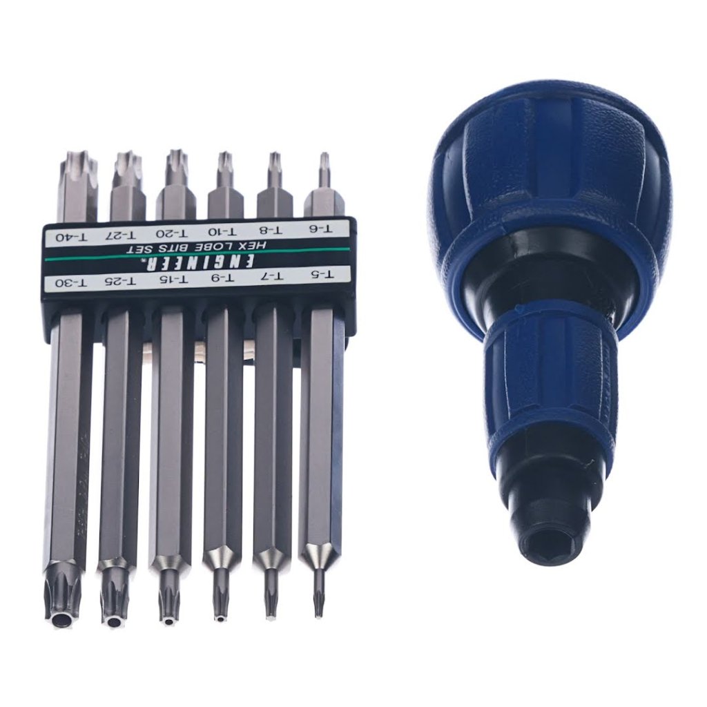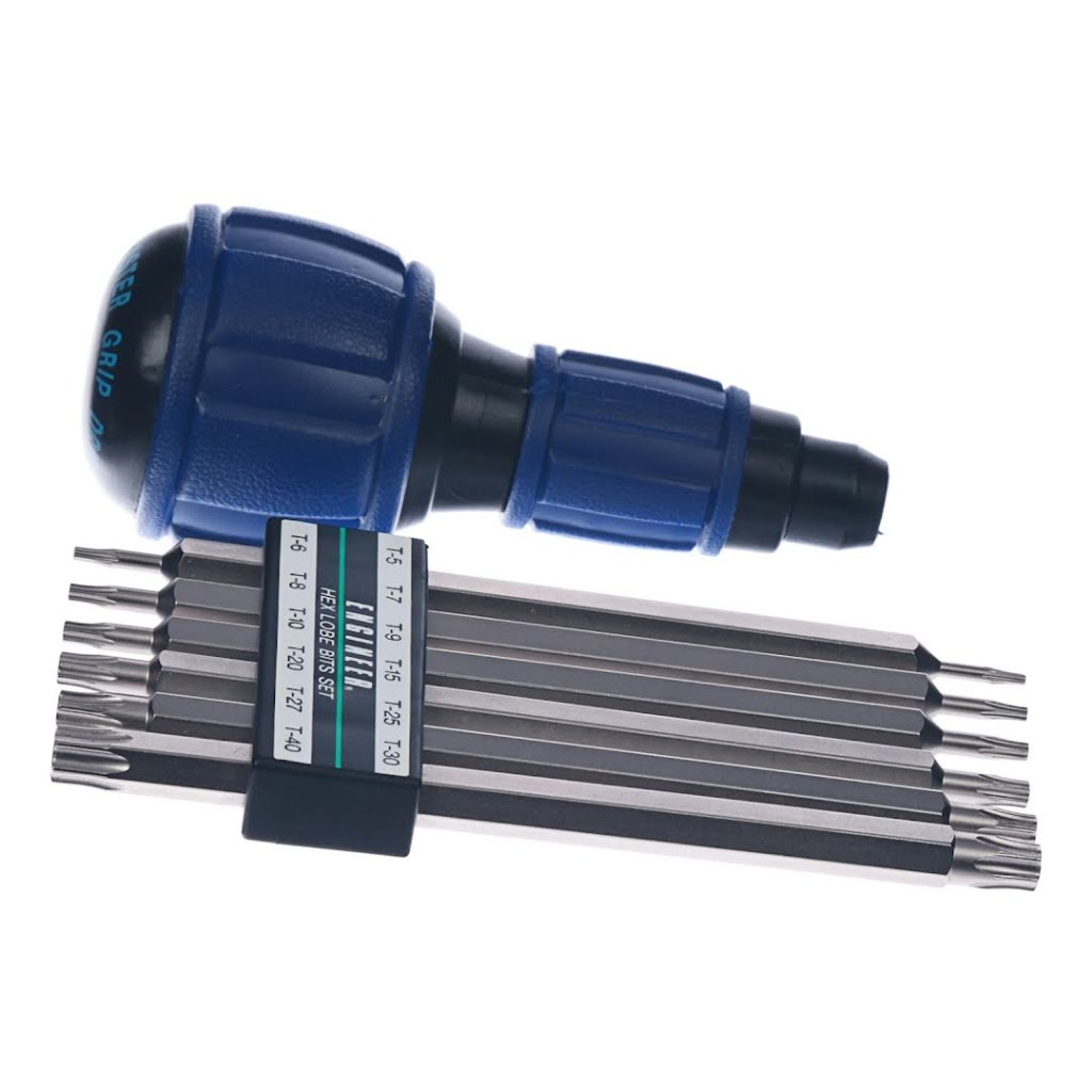 The ENGINEER Japanese Master Grip Screwdriver Set, model DR-51, is a versatile tool designed for working with specialized screws. It includes a set of 12 Torx bits ranging from T5 to T40, all featuring high-precision silver coating and made from chrome-vanadium steel. The tool also features a comfortable cushion grip that fits well in the hand, making it ideal for tightening and loosening tasks.