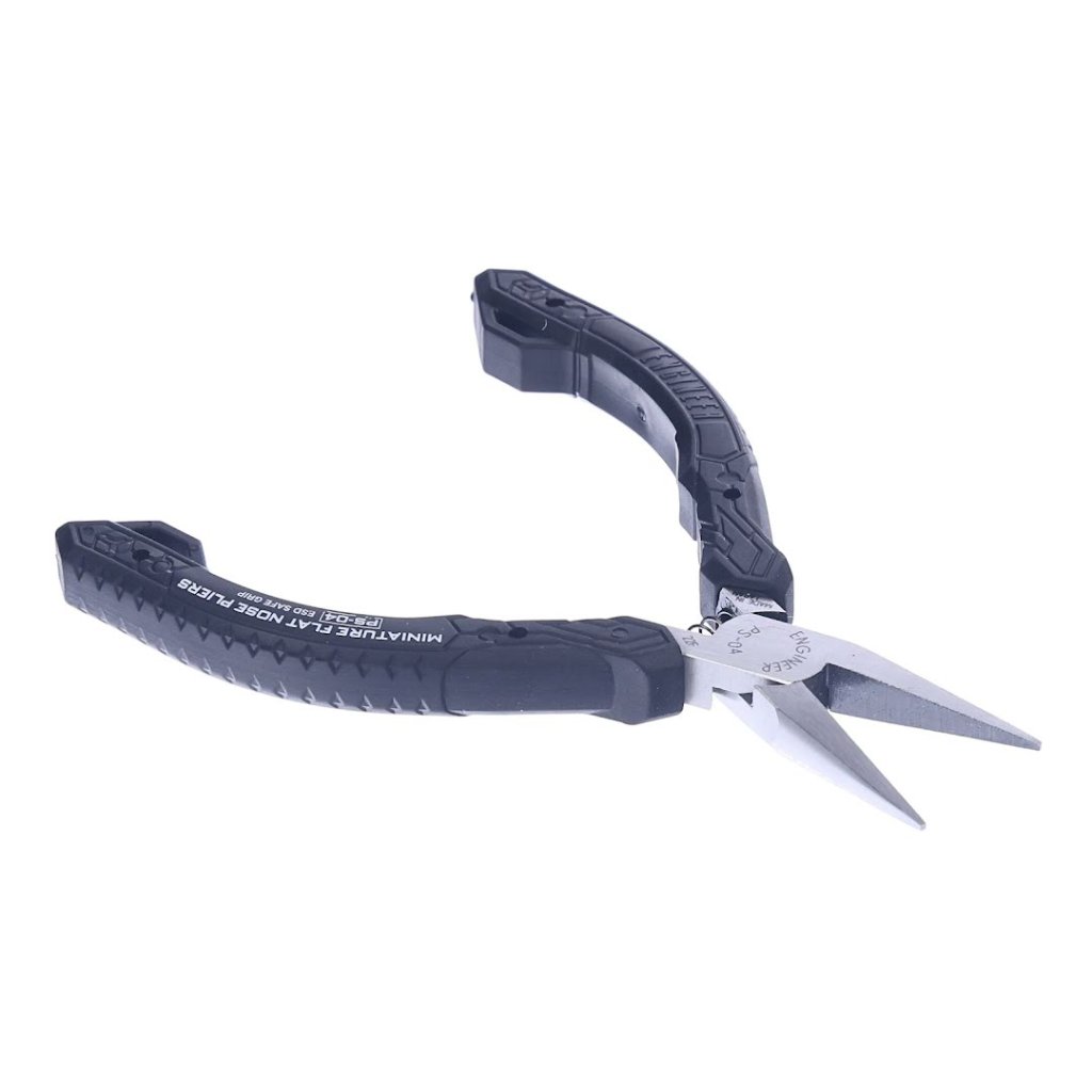 The ENGINEER Mini Flat Nose Pliers, model PS-04, is designed for precision tasks with its ultra-fine square tip. This tool is ideal for delicate work where avoiding damage is crucial, thanks to its smooth jaws that prevent the marring of your workpiece. With dimensions of 50 x 132 x 11 mm and weighing just 69 g, it provides a compact and lightweight option for intricate projects. The pliers have been hardened for excellent durability and feature an ergonomic elastomer grip for comfort and ESD-safe handles to protect sensitive components from static damage.