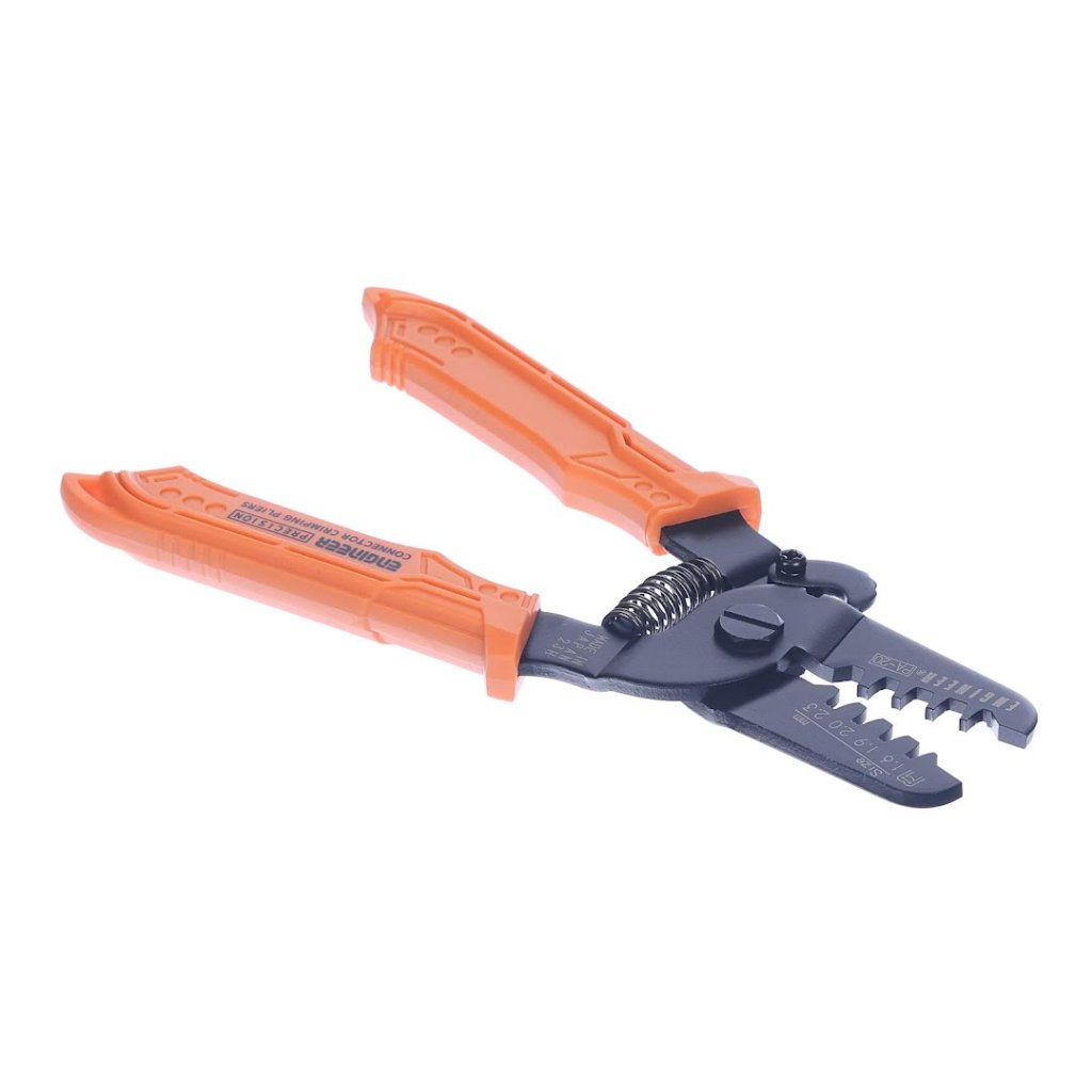 The ENGINEER Precision Crimping Plier, model PA-20, is adept at executing high-precision crimps on small to medium-sized contact pins. Its compact design, with dimensions of 57 mm in width, 175 mm in height, and 12 mm in depth, weighing just 137 g, makes it highly manageable for detailed work. The plier is designed explicitly for crimps corresponding to 2.5 mm to 5 mm pitch, accommodating a wide range of terminals thanks to its ability to adjust the crimp height for individual crimping of the conductor and insulation barrels. It includes four interchangeable dies with widths of 1.6, 1.9, 2.0, and 2.3 mm, making it versatile for various crimping needs. This tool is essential for precise electrical work and is suitable for wire gauges ranging from AWG28 to AWG18.