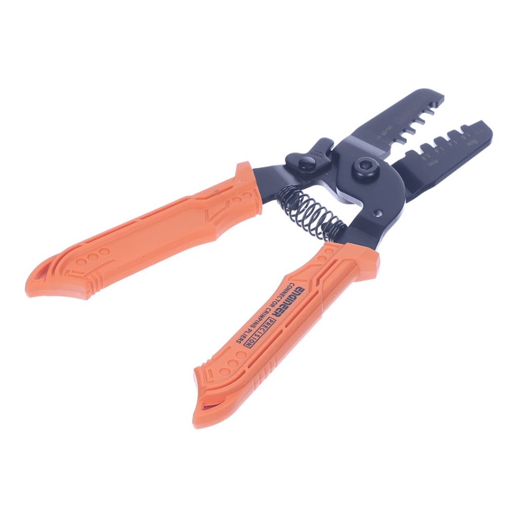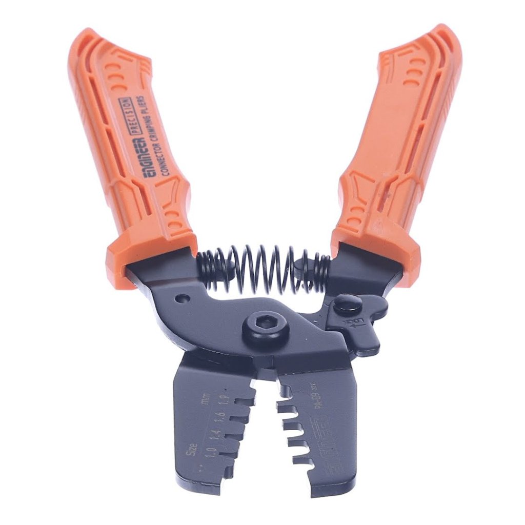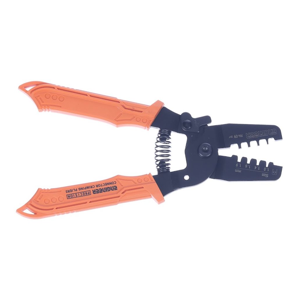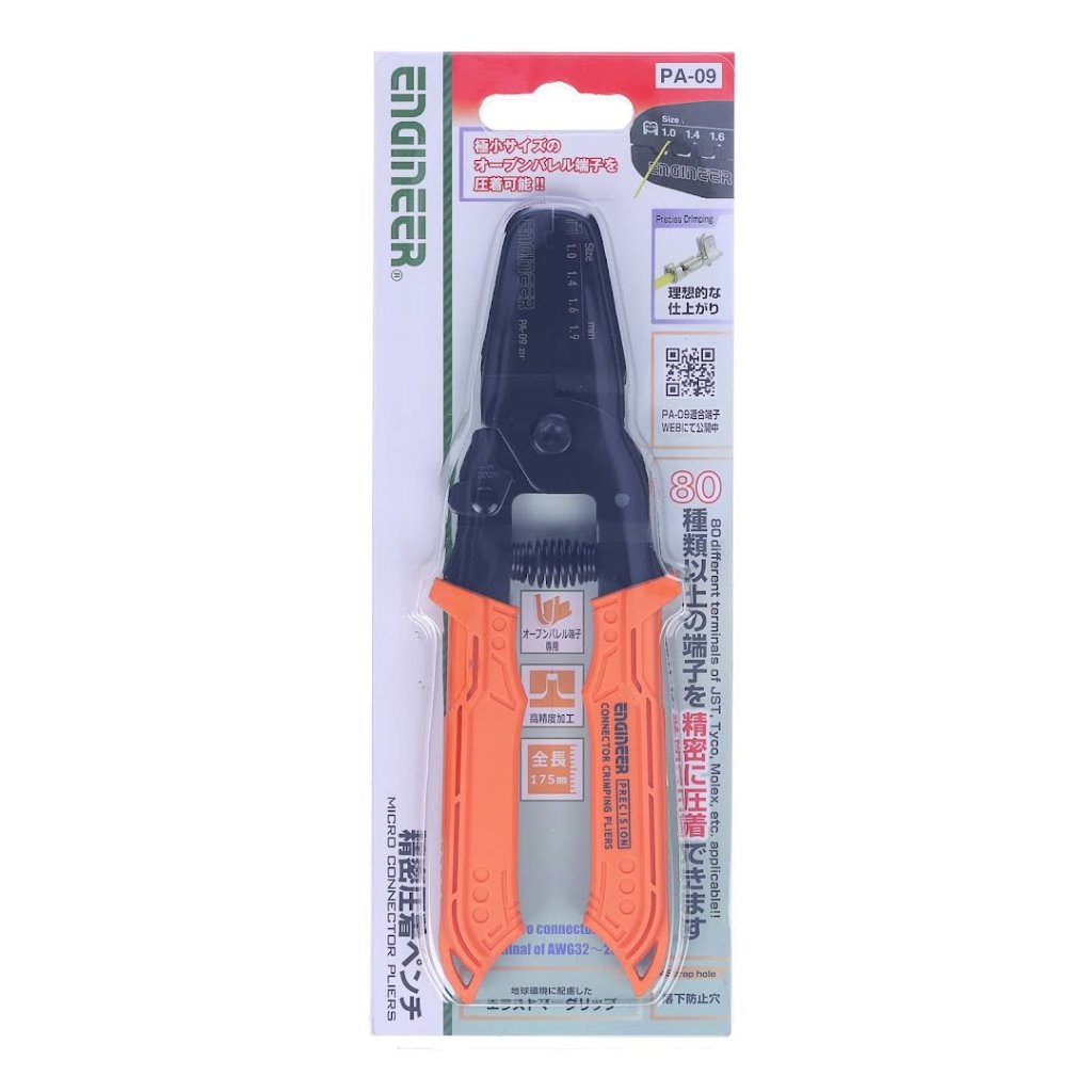 The ENGINEER Precision Crimping Pliers, model PA-09, is a versatile tool designed to meet the needs of precise crimping tasks. Capable of crimping over 80 types of terminals into the ideal shape, this plier accommodates a wide range of miniature contact pins with high accuracy. It features four interchangeable die sizes, making it suitable for crimping terminals from 1.25 mm to 2.5 mm pitch and wires ranging from AWG32 to AWG20. The dies are designed with a thin profile for optimal crimping of tiny pins. Its grip is made from an oil-resistant elastomer for user comfort and environmental considerations. With dimensions of 57 mm in width, 175 mm in height, and 12 mm in depth, and weighing just 135 g, it combines lightweight design with robust functionality for precision crimping tasks.