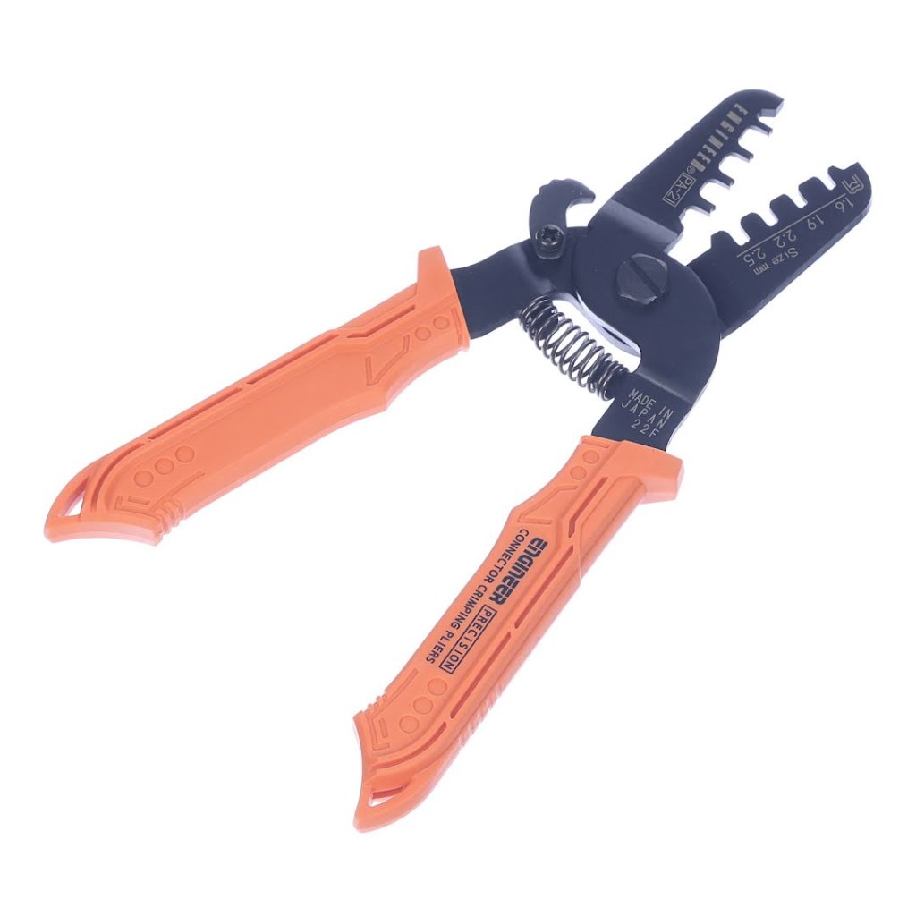The ENGINEER Precision Crimping Pliers, model PA-21, is designed to crimp over 100 types of terminals into the ideal shape, catering specifically to ultra-small terminals such as half-pitch connectors. This tool features a new die shape that accommodates terminals with long barrels and includes four interchangeable dies, making it versatile for various crimping needs. It supports wires ranging from AWG26 to 18, ensuring compatibility with a broad spectrum of wire sizes. The ergonomic design includes an environmentally friendly elastomer grip, enhancing comfort during extended use, and a simple adjustment mechanism to maintain precision.