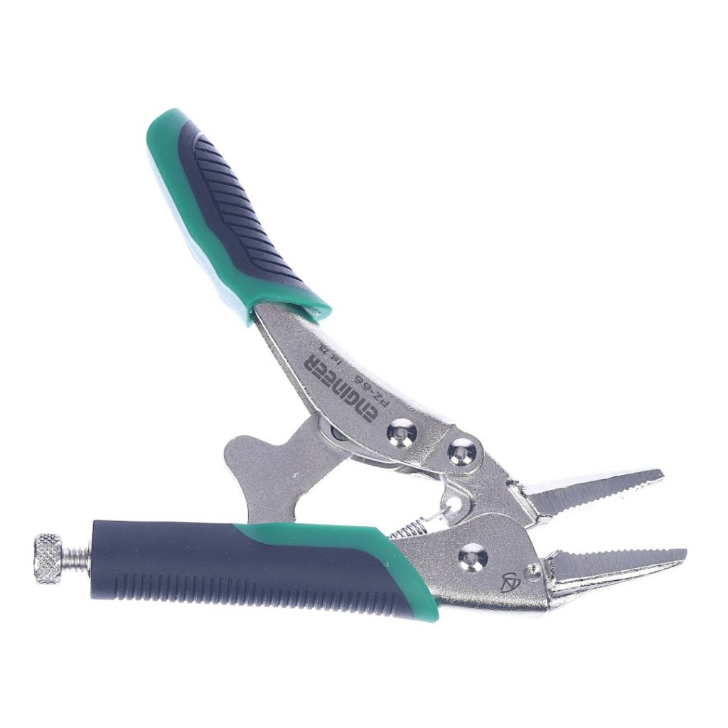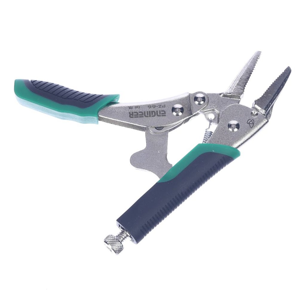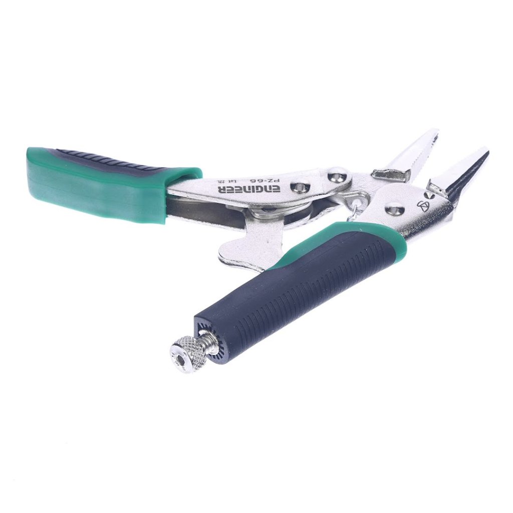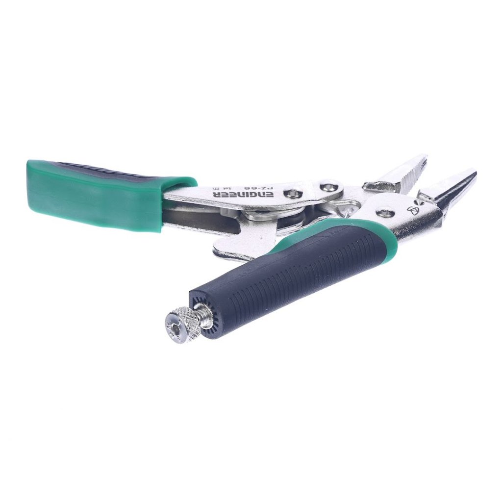 The ENGINEER Screw Extraction Pliers, model PZ-66, is a precision tool designed to grasp and remove damaged or rusted screws easily. Featuring a unique vice mechanism, it securely grips screws, allowing for effective turning and removal. Its middle nose type design makes it suitable for extracting screws in hard-to-reach places, including low-profile truss screws, thanks to its patented technology. The plier's easy-release mechanism ensures quick and safe disengagement, and the adjustment screw with a hex socket allows for tightening adjustments. Crafted for screws with head sizes between 3.0 to 5.5 mm and a hardness of HRC 57±3, this tool combines functionality with durability for professional and DIY use alike.