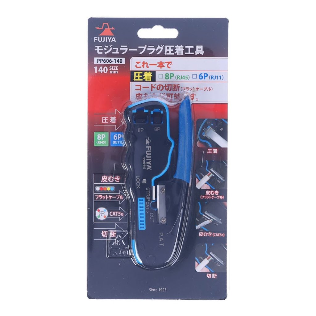 The FUJIYA Modular Plug Crimper is a versatile tool for precision crimping during communication wiring. Its compact body integrates essential functions such as crimping, cutting, and stripping cables. Suitable for standard modular plugs 8P (RJ45) and 6P (RJ11), it is an indispensable tool for working with flat and LAN cables (CAT5e). Its dimensions (65 x 140 x 25 mm) and weight (308 g) make it easy to handle and operate.