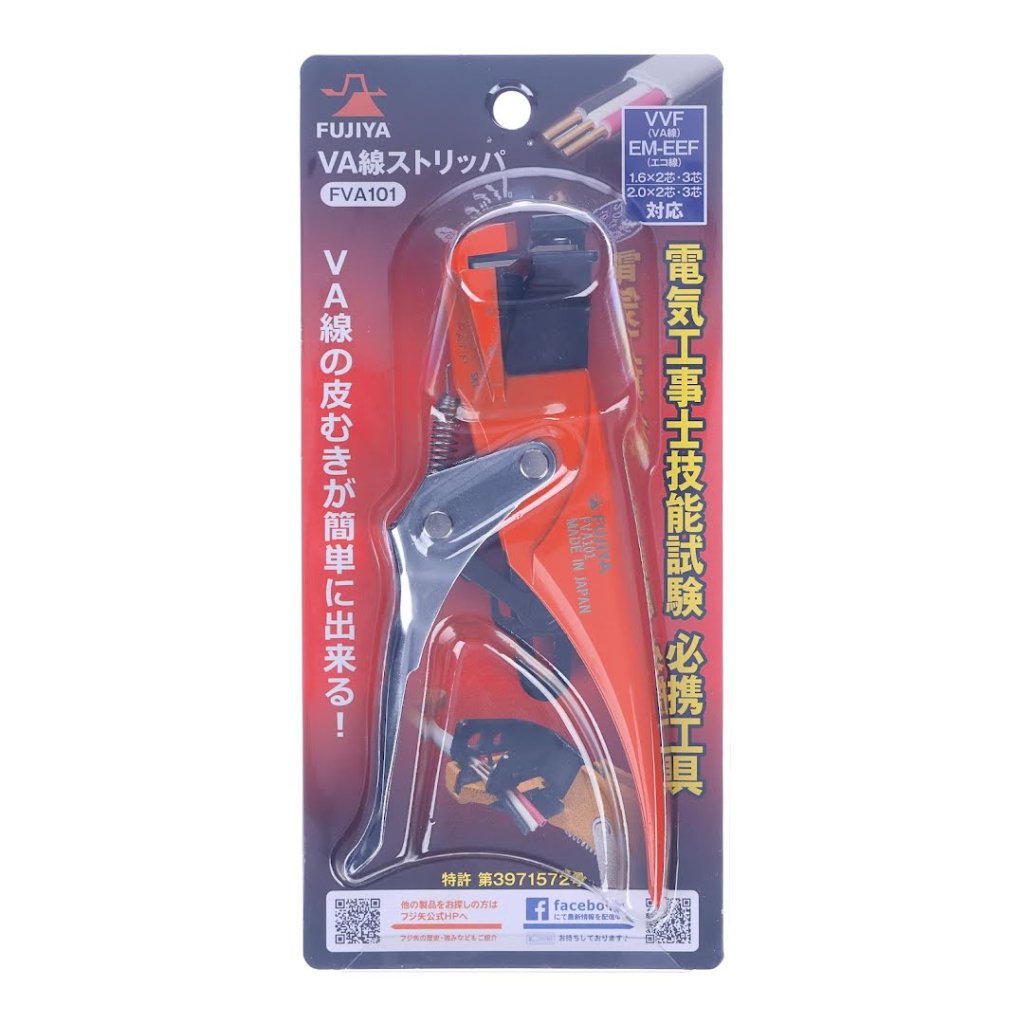 The FUJIYA VA Cable Stripper, model FVA101, is a specialized tool designed for precision and ease of stripping VA and eco-cables. Its compact size of 114 mm in width allows for comfortable use, even for those with smaller hands. This tool eliminates the need for a utility knife, offering a safe and straightforward stripping process without requiring blade height adjustments. The blades are easily replaceable, ensuring long-lasting performance. Additionally, it features a fall prevention cord hole and a convenient gauge for use during electrical installation exams, making it an essential tool for electrical wiring tasks.