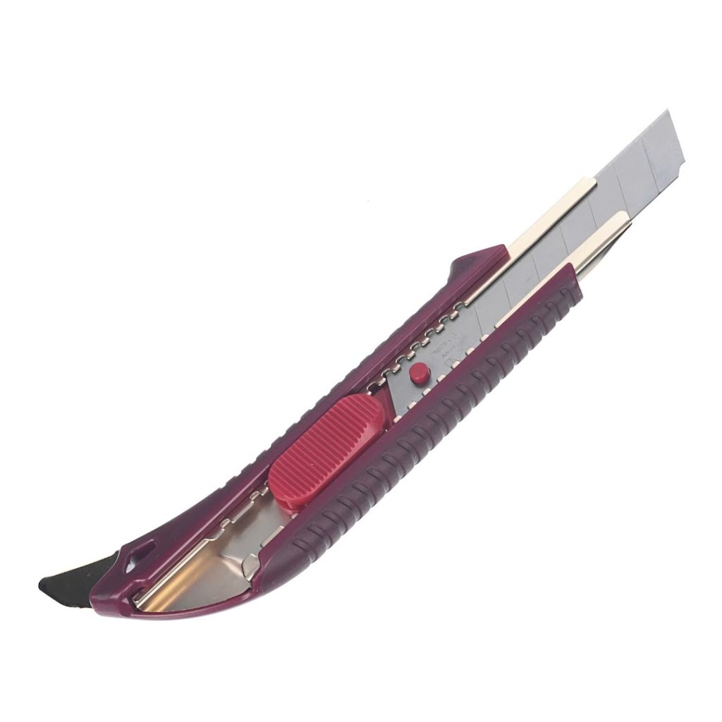The KAI Japanese Heavy Duty Snap-Off Knife for Cutting Flooring, model L-003, is explicitly designed for precision and durability in interior, flooring, and electrical installations. Its ergonomically designed hard rubber handle fits comfortably in the hand, enhancing work efficiency alongside its smooth auto-lock slider for quick and safe blade adjustments. With a focus on durability, it features a tempered metal guide and metal claw with a premium matte gold-plated finish, ensuring visibility and longevity. The knife's auto-lock slider can withstand up to 40 kg of pressure, making it ideal for both push and pull cuts.