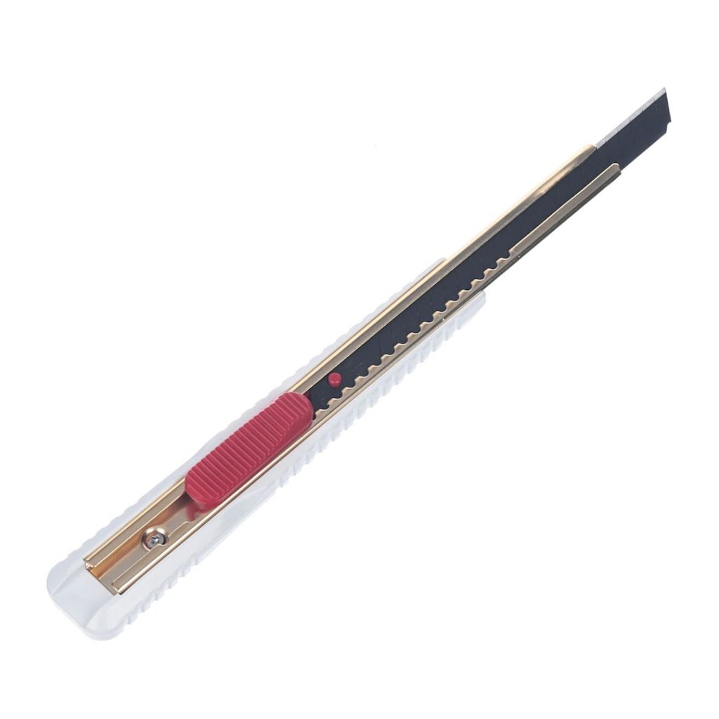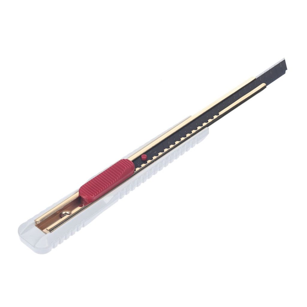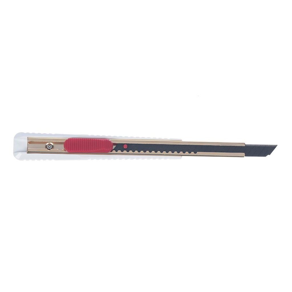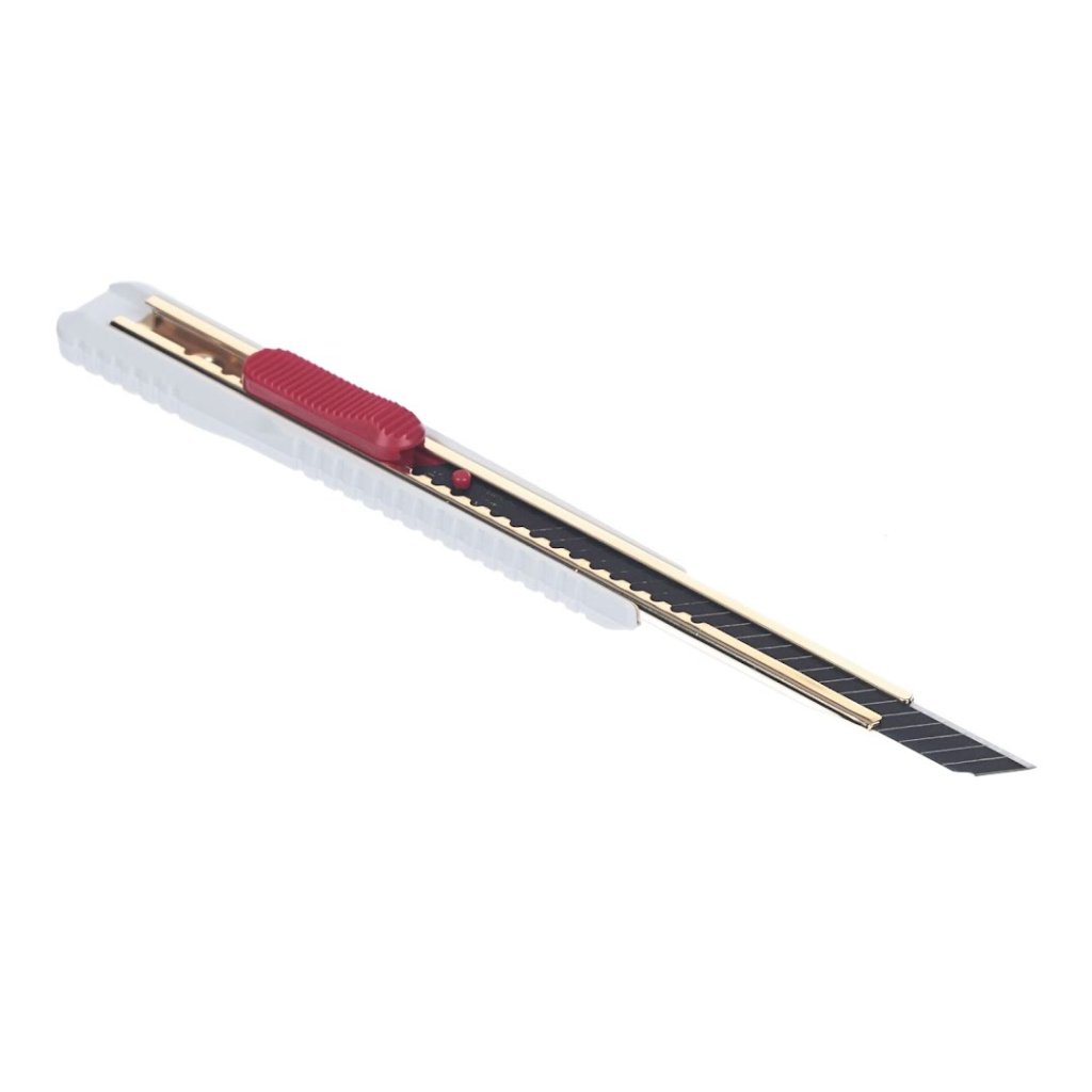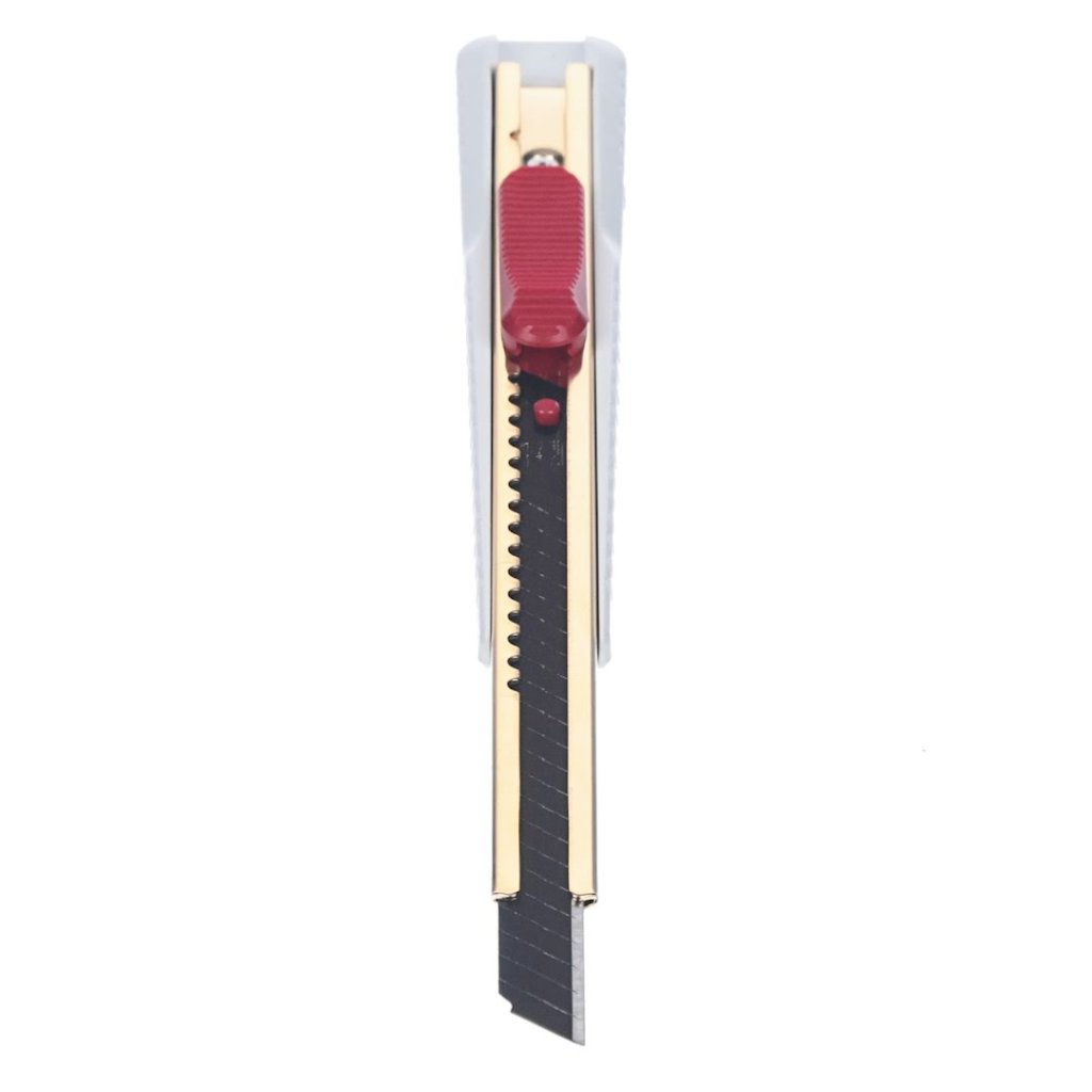 The KAI Japanese Long Snap-Off Knife for Cutting Wallcoverings, model D-002, is explicitly designed for precision and ease in interior construction projects. Its blade is made from 0.38 mm thick material, ensuring minimal blade wobble and straight cuts. The tool features a long blade to reduce the frequency of blade changes, enhancing efficiency. It incorporates a smooth auto-lock slide mechanism and a tempered metal guide for durability, with an ergonomic handle and slider shape for comfort. The knife is finished with a high-quality matte gold plating for a touch of luxury.