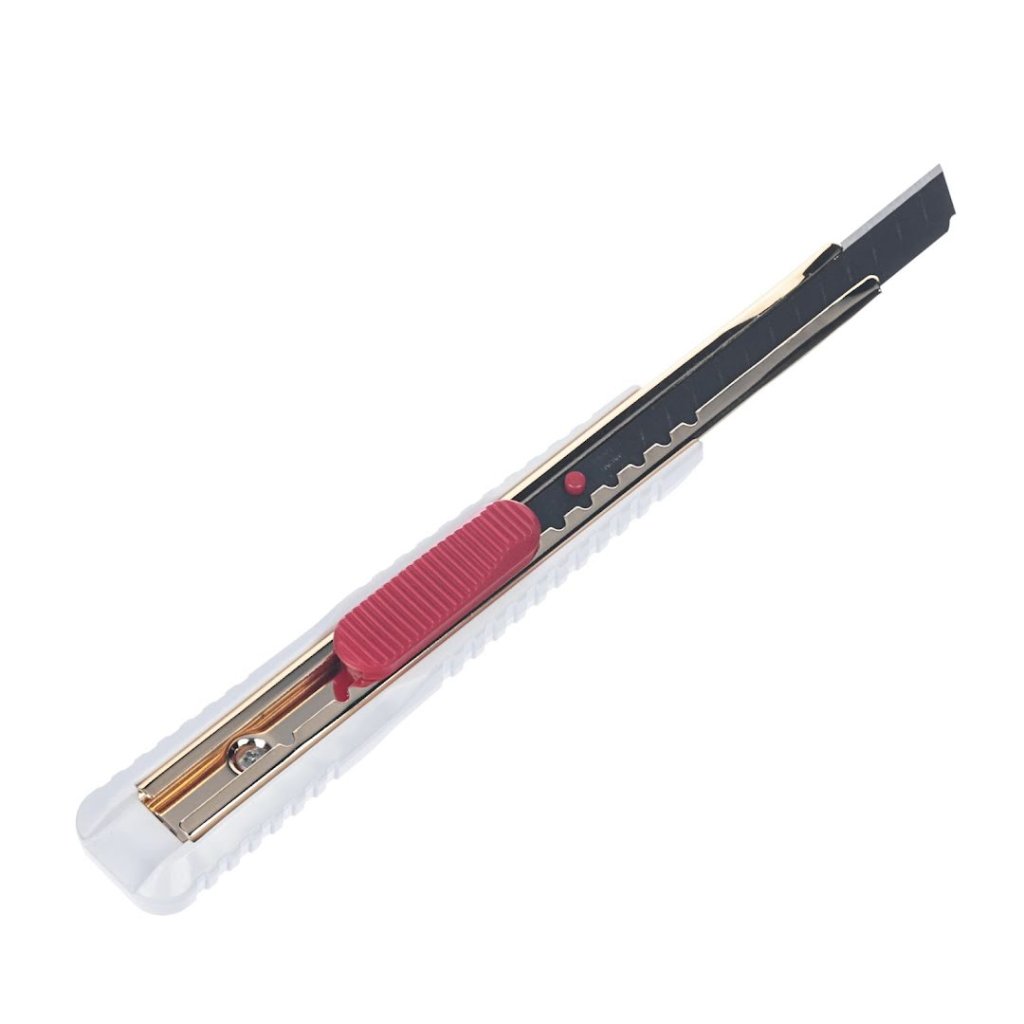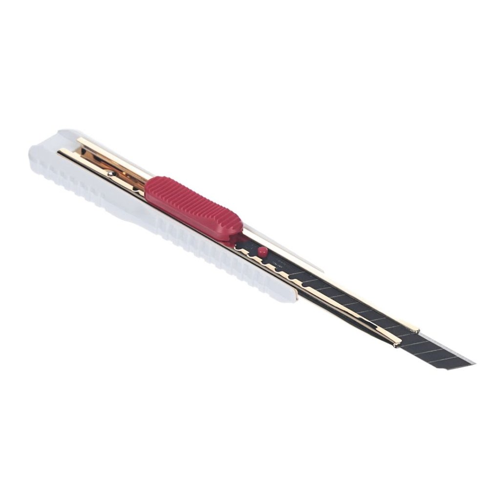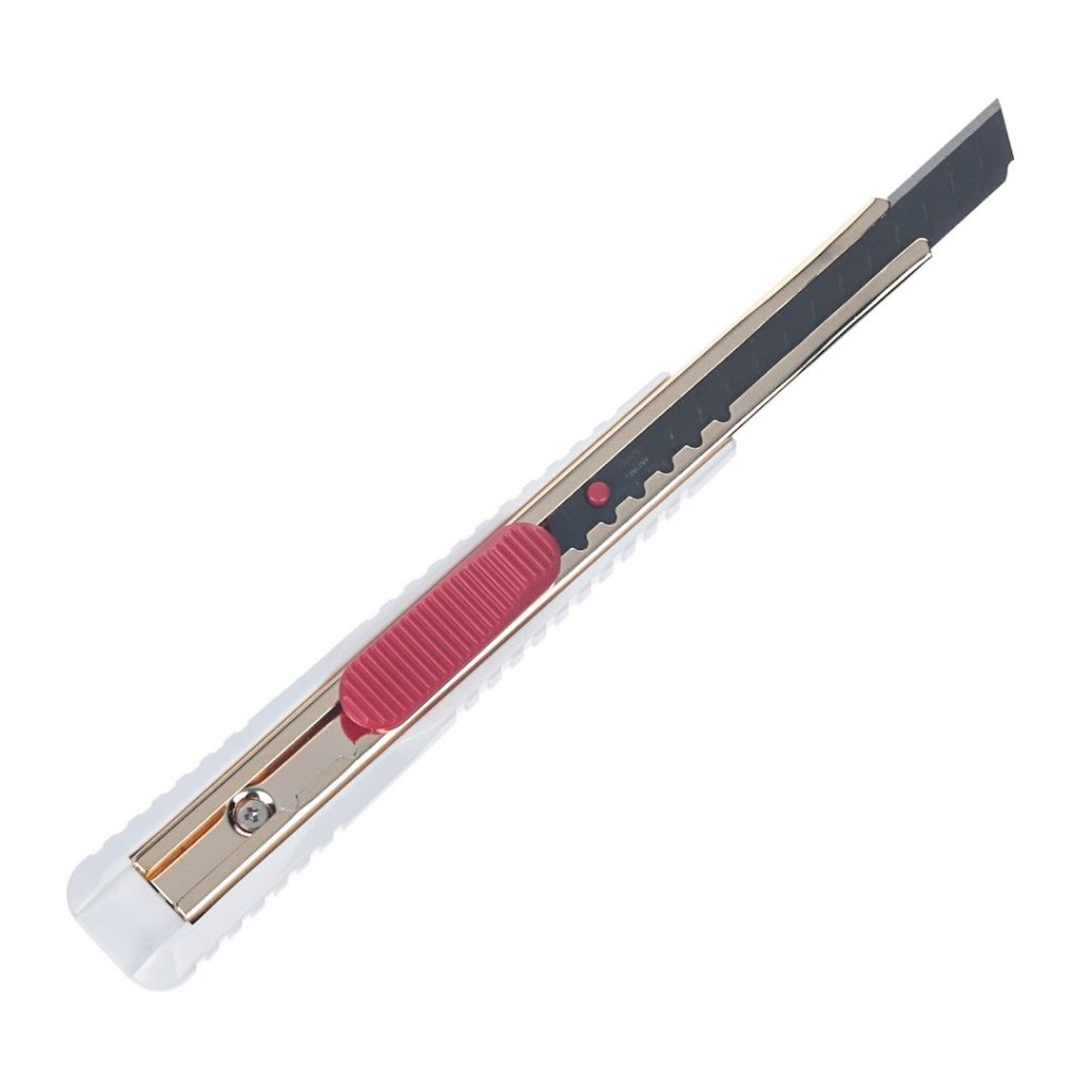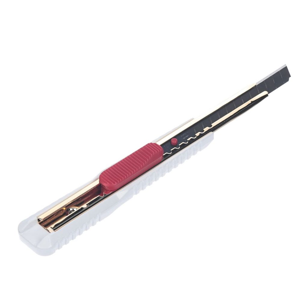 The KAI Japanese Small Snap-Off Knife, model S-002, is designed to cut wallcoverings precisely and easily. This compact tool features a comfortable handle and smooth auto-lock slide mechanism, enhancing work efficiency. It's constructed with a hardened metal guide for increased durability and a luxurious matte gold-plated finish. The knife incorporates an ultra-sharp blade, and the metal guide boasts antibacterial, anti-rust, and non-stick properties, making it a superior choice for interior construction projects.
