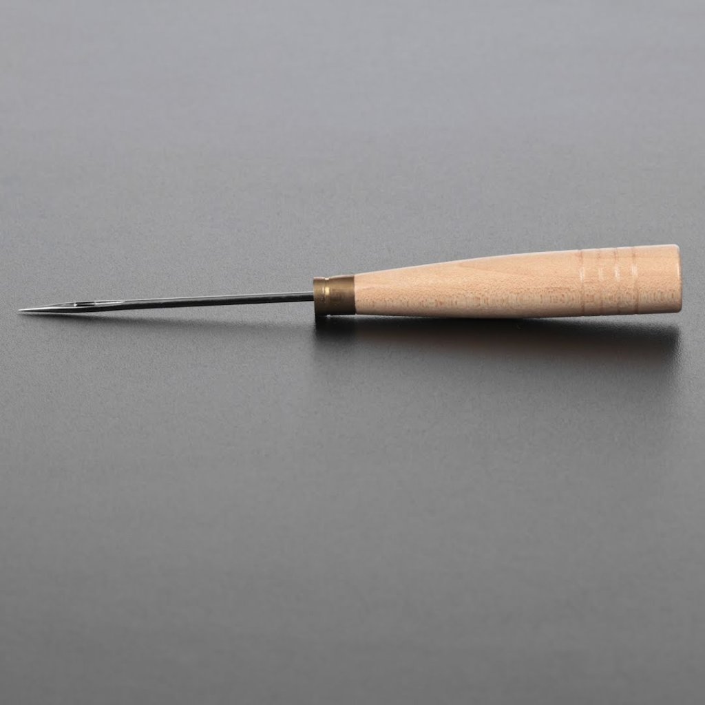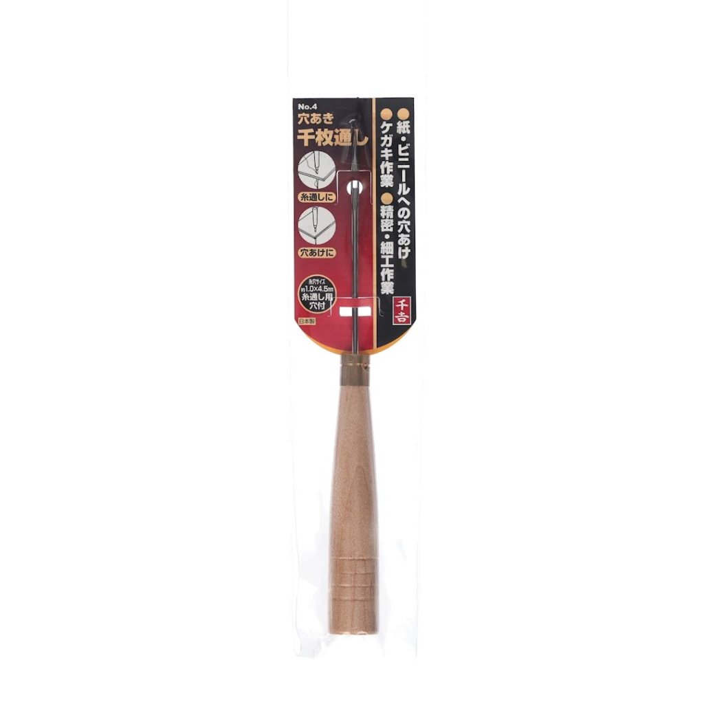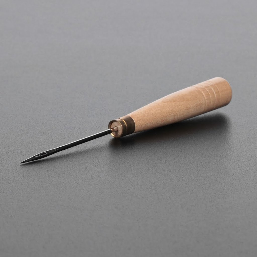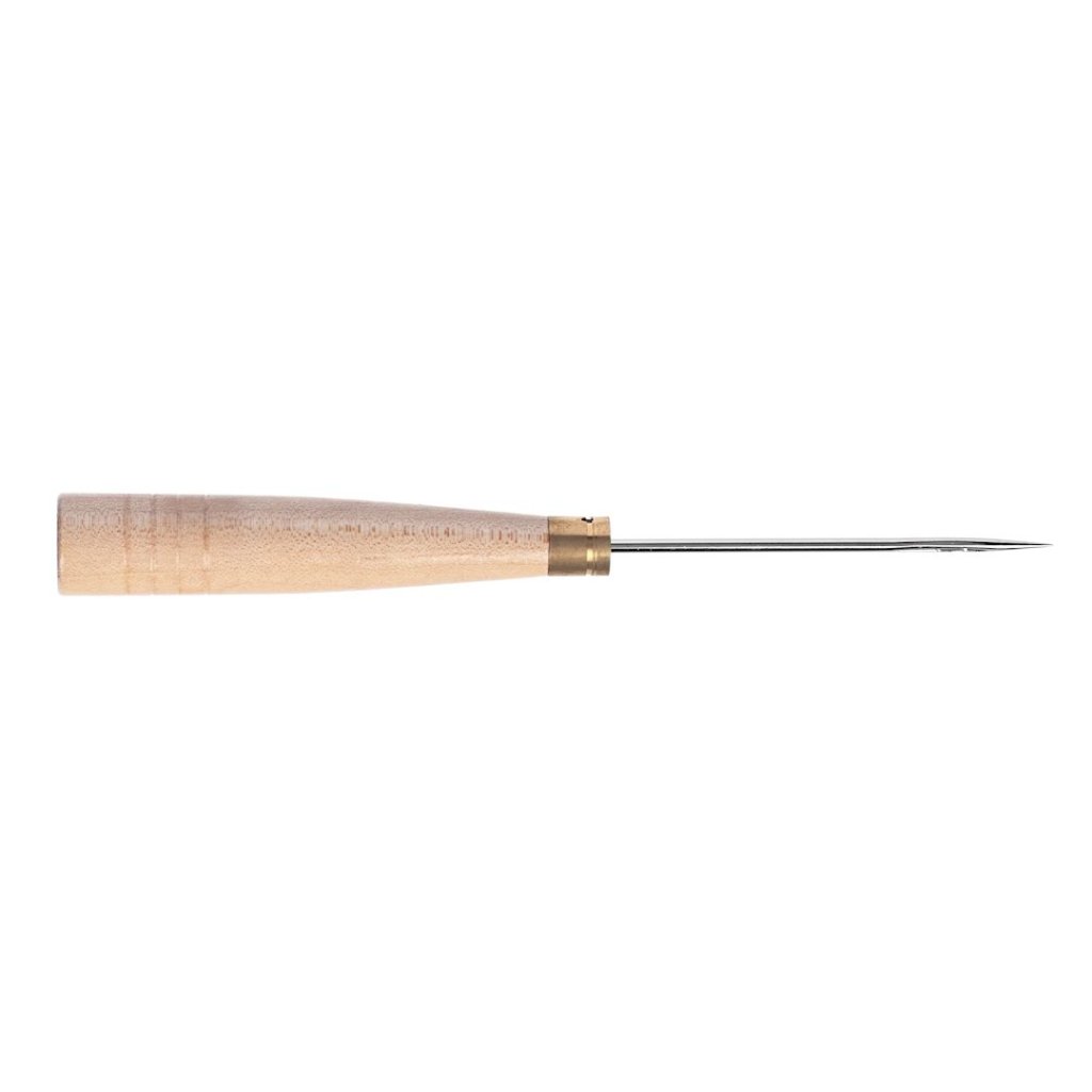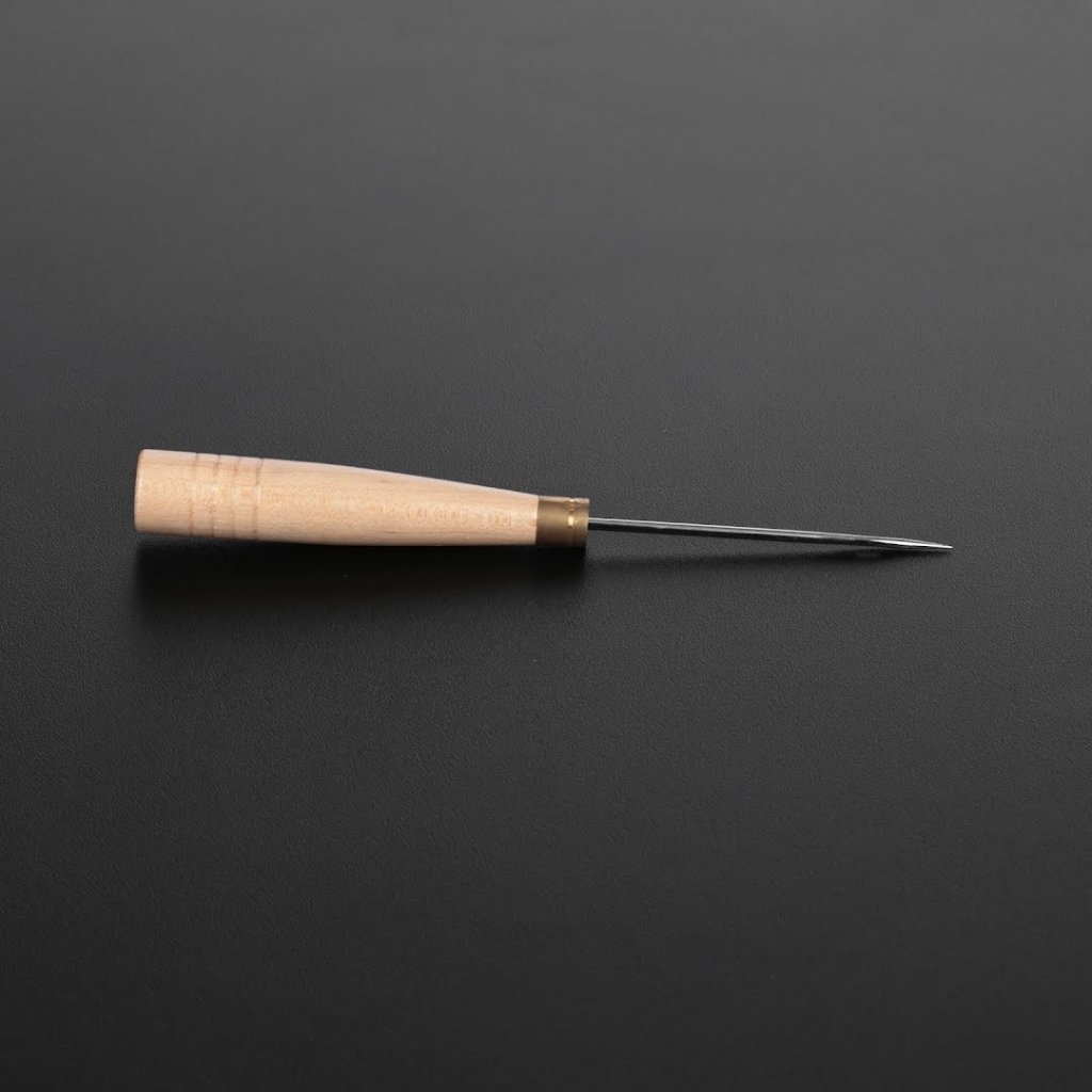 The SENKICHI Japanese Sewing Awl, model No.4, is essential for piercing paper and vinyl. With a total length of 165 mm and a needle length of 75 mm, it's designed for precision in scribing and detailed work. The awl features a sturdy handle and a sharp, durable needle, making it perfect for various crafting needs.