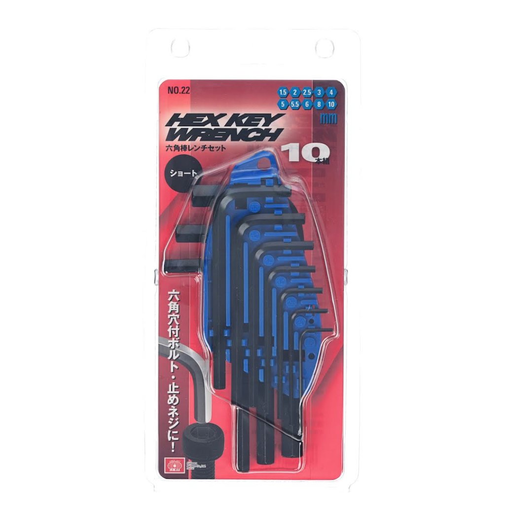 The SK11 10-Piece Hex Key L-Wrench Set, No.22, is an essential toolset designed for precision tightening and loosening of hexagonal bolts and screws. Each set includes ten metric-sized short wrenches conveniently housed in a holder for easy storage and portability. Crafted for durability and efficiency, this set ensures you have the correct size for various tasks. Please ensure to use the proper size for each bolt or screw and avoid applying impact with hammers.