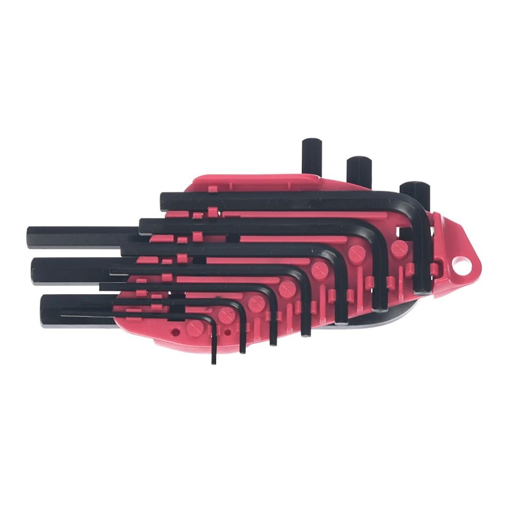 E-VALUE 9-Piece Hex Wrench Set with rust-resistant nickel plating, and sizes ranging from 1.5 mm to 6 mm. The set also comes with a flip-open holder.