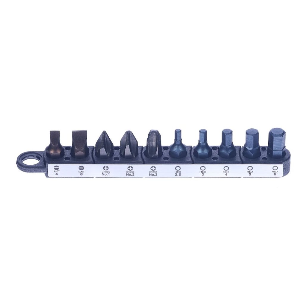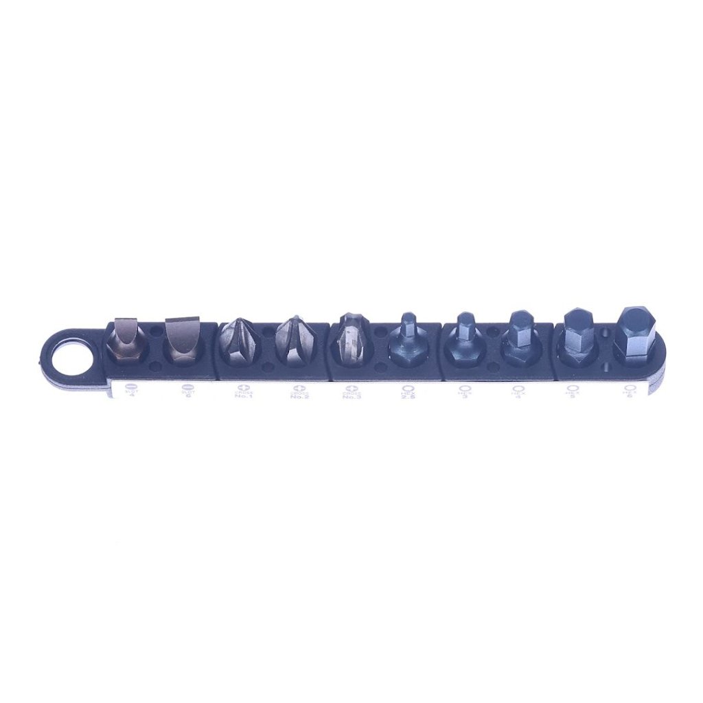 The SK11 10-Piece Screwdriver Bit Set is a versatile and essential tool kit designed for tightening and loosening screws. Each bit in this set is coated with a micro-coat treatment for high precision and to reduce environmental impact. The set includes a variety of sizes: PH1, PH2, PH3, SL4, SL6, H2.5, H3, H4, H5, and H6, making it suitable for a wide range of applications. With dimensions of 19 x 109 x 12 mm and a weight of 44 g, this compact set is easy to carry and store, ensuring that you have the right bit at hand whenever needed.