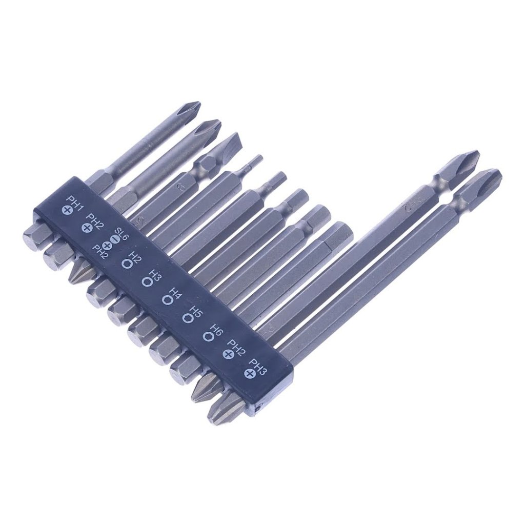 E-VALUE 10-piece screwdriver bit set with holder, perfect for electric screwdrivers. Compact, portable, and organized.