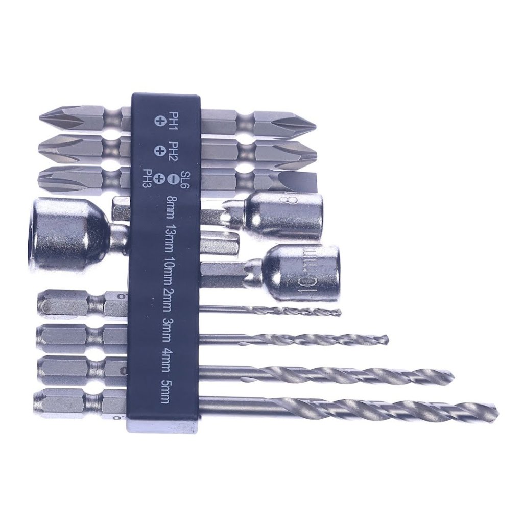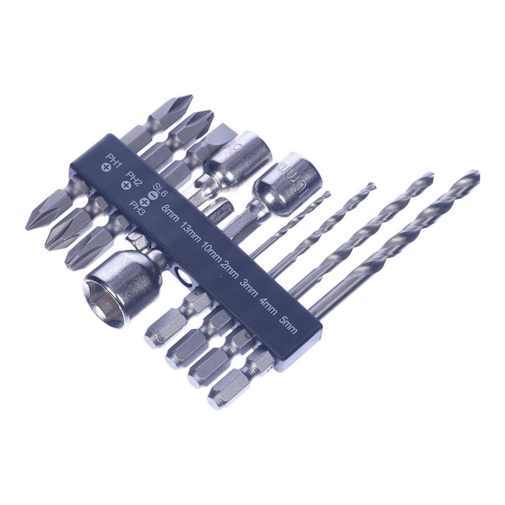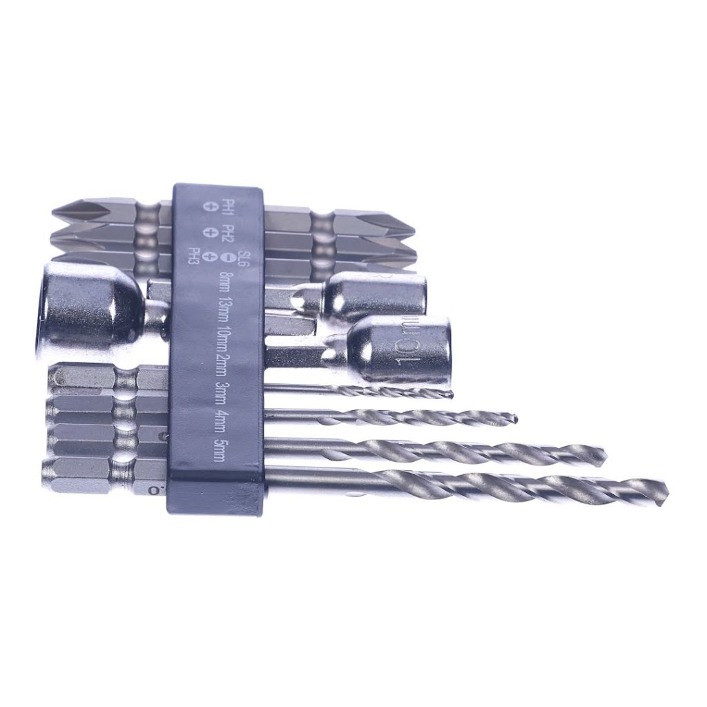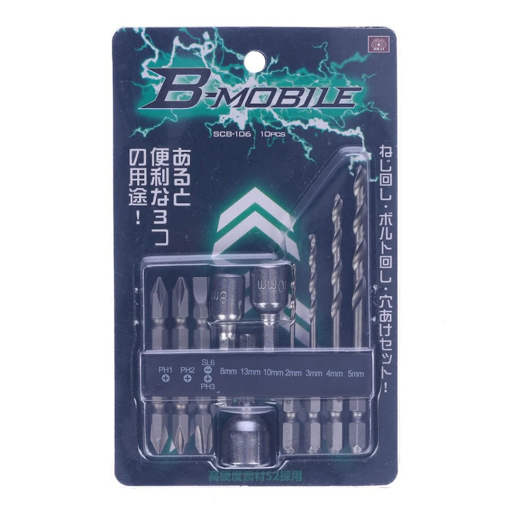 The SK11 10-piece Universal Bit Set with Holder is an essential toolkit designed for versatility and convenience in screwing, bolting, and drilling tasks. This set includes three bits, three sockets, and four metal drill bits, all neatly organized in a durable holder. It's compatible with drill and impact drivers and perfect for working on thin metal sheets, wood, and plastic. With 10 pieces, the SK11 SCB-106 set offers a comprehensive solution for your fastening and drilling needs.