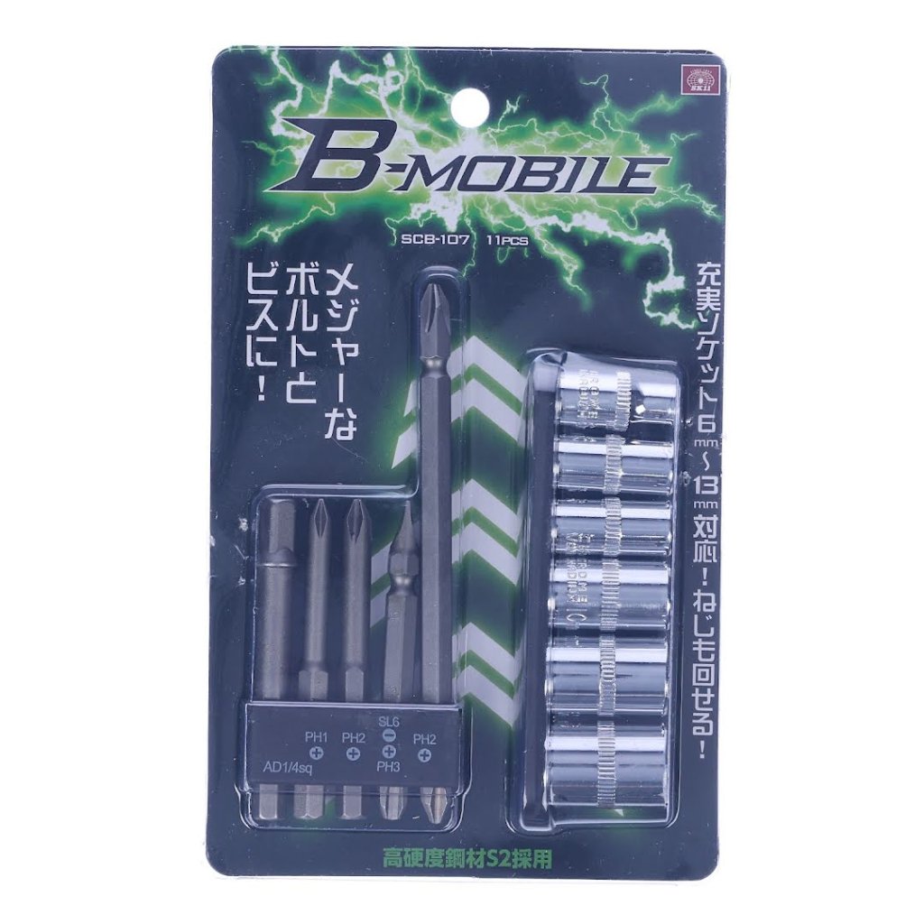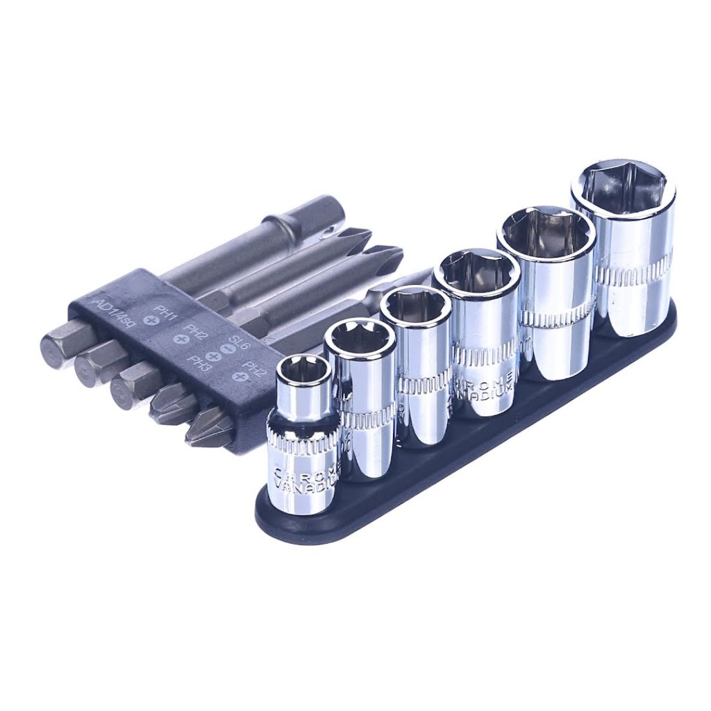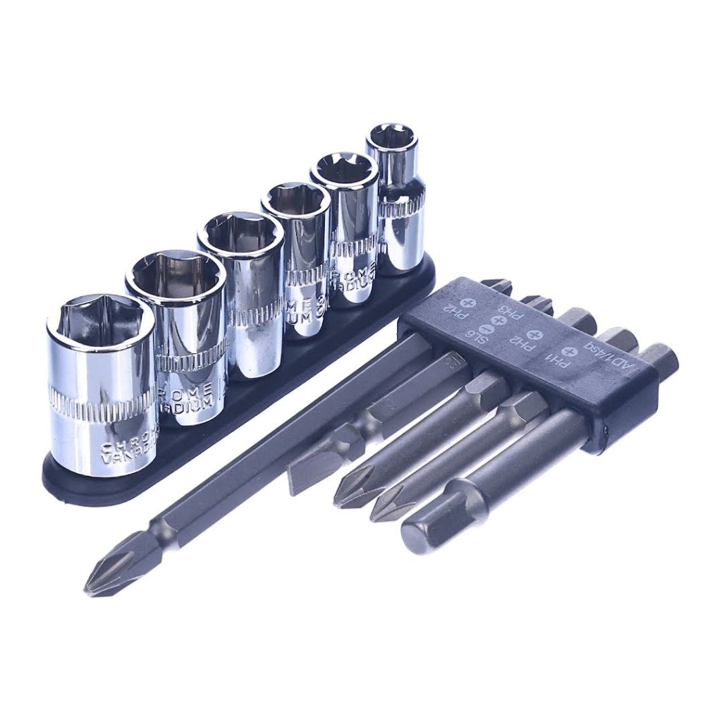 The SK11 11-piece Universal Bit Set with Holder is a comprehensive screwdriver bit set designed to fit drill and impact drivers for versatile screwing tasks. This set includes four screwdriver bits, an adapter, and six sockets. It also comes with a holder for convenient storage and accessibility. Its variety allows for efficient screw-tightening operations, whether for professional or home use. The compact, lightweight design ensures it's a practical addition to any toolkit.