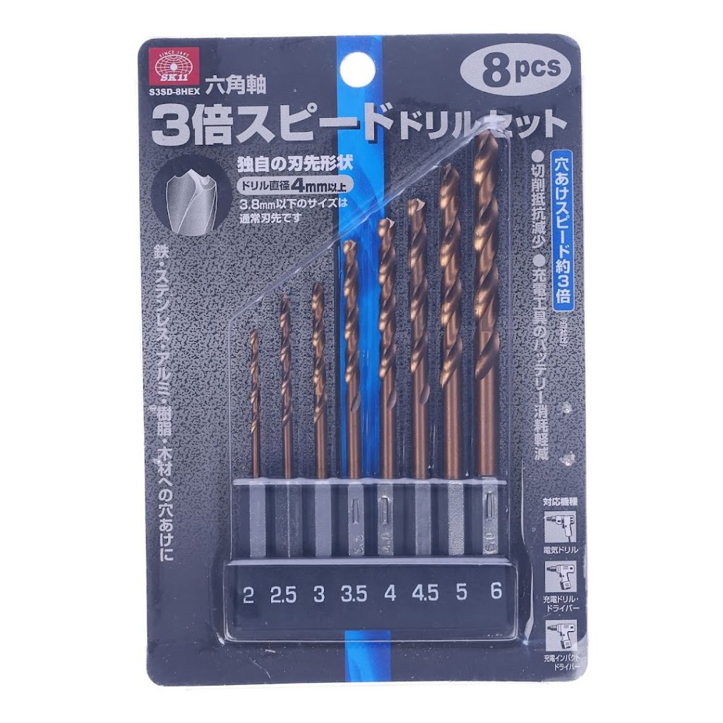 The SK11 3X Speedy Drill Bit Set, model S3SD-8HEX, is designed to make your drilling tasks three times faster than conventional drills, perfect for working with iron, stainless steel, aluminum, wood, and plastic. This drill bit set includes sizes ranging from 2.0 mm to 6.0 mm, all featuring a hexagonal shaft for compatibility with electric drills, cordless drill drivers, and cordless impact drivers. The unique cutting-edge design reduces cutting resistance, enabling faster drilling with less burr and more accurate, circular holes. Additionally, the reduced friction minimizes heat build-up, protecting the battery life of your cordless tools.