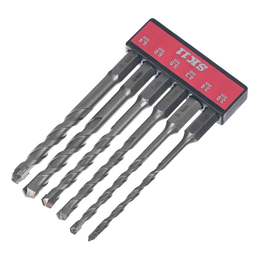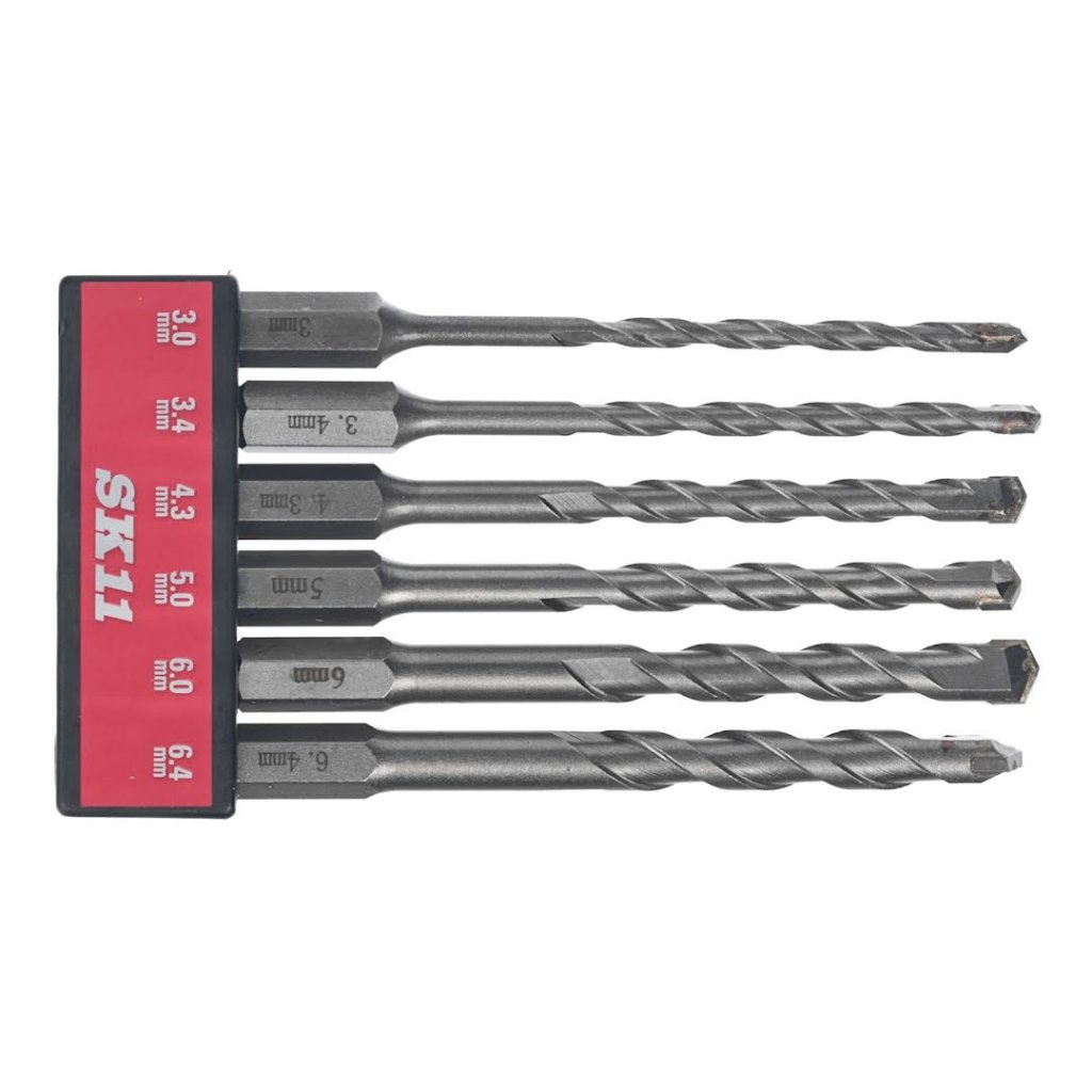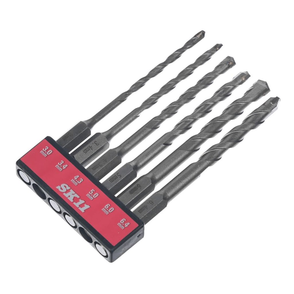 The SK11 6-Piece Masonry Drill Bit Set is ideal for drilling holes in blocks and mortar. This set includes six sizes, ranging from 3.0 mm to 6.4 mm, with a 6.35 mm hex shank for easy compatibility. Designed for high durability and minimal wobble, the one-piece construction from shank to tip ensures precise drilling. The unique tip design is optimized for rotation mode, making the drilling process smooth and efficient.