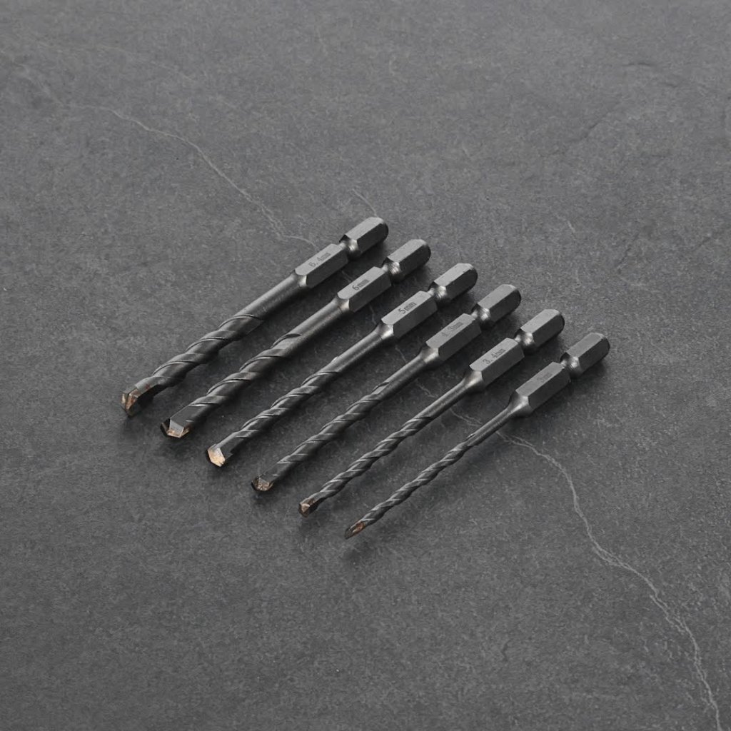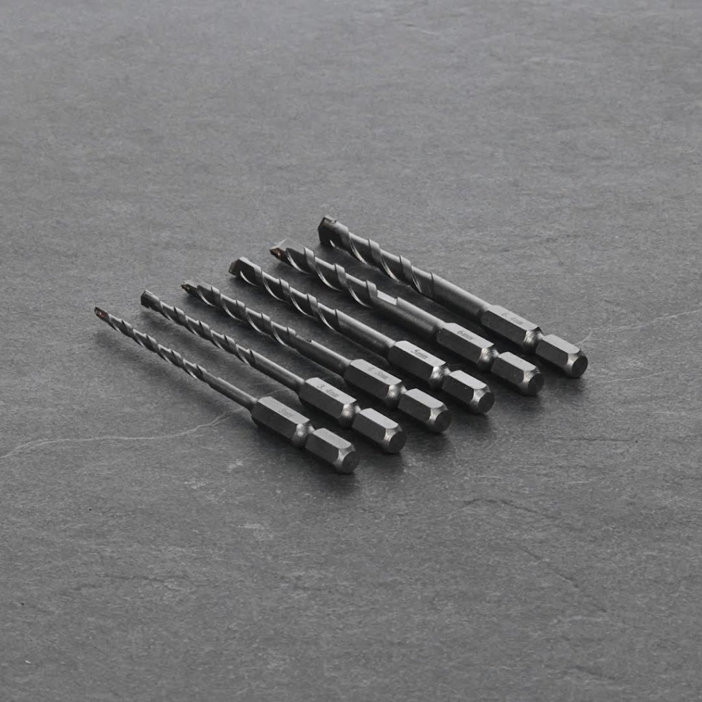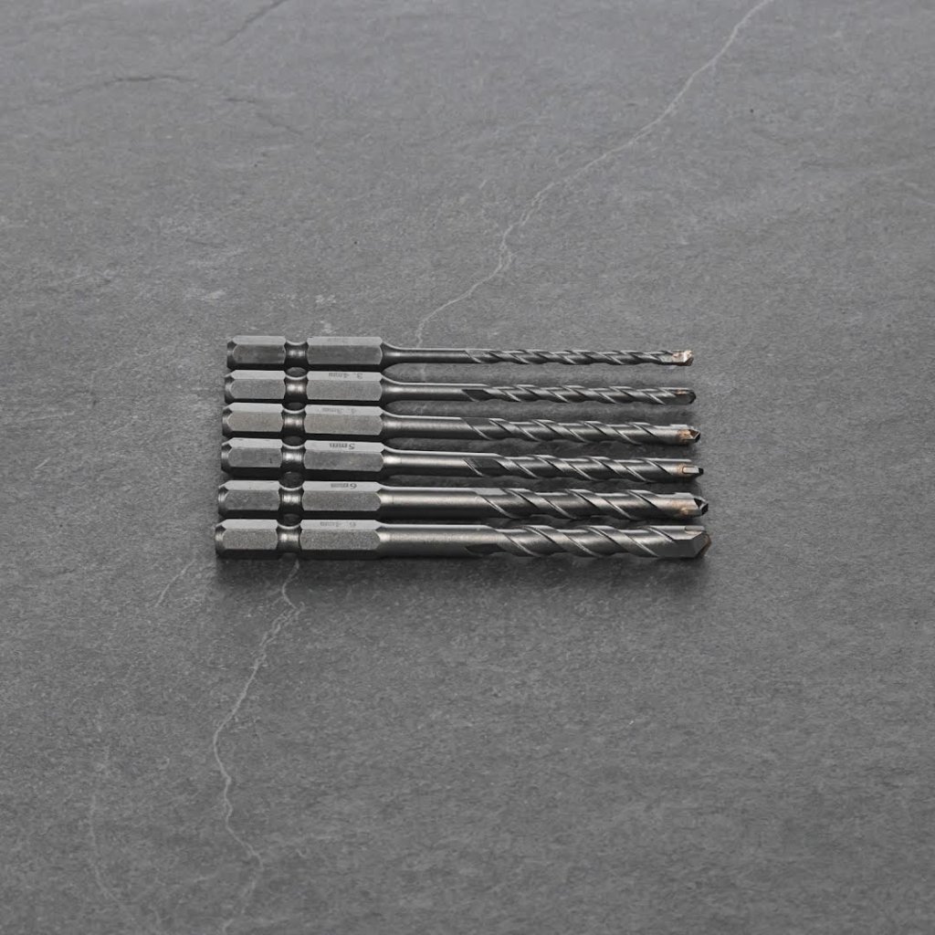 The SK11 6-Piece Masonry Drill Bit Set is ideal for drilling holes in blocks and mortar. This set includes six sizes, ranging from 3.0 mm to 6.4 mm, with a 6.35 mm hex shank for easy compatibility. Designed for high durability and minimal wobble, the one-piece construction from shank to tip ensures precise drilling. The unique tip design is optimized for rotation mode, making the drilling process smooth and efficient.