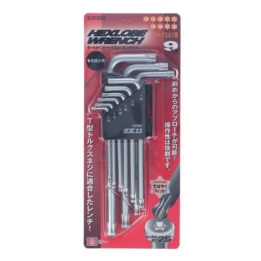 The SK11 9-Piece Torx Key L-Wrench Set is designed for precision and ease in T-type Torx screw tightening and loosening tasks. Its ball-point shape allows insertion into Torx slots at an angle, making it ideal for work in tight or obstructed spaces. The set includes nine pieces, each featuring a chrome-plated finish for durability and a semi-long design for improved leverage. The shorter end is notched, catering to tamper-resistant Torx screws, ensuring a quick and secure fit. With dimensions of 77 x 155 x 22 mm and a weight of 297 g, this tool set combines practicality.