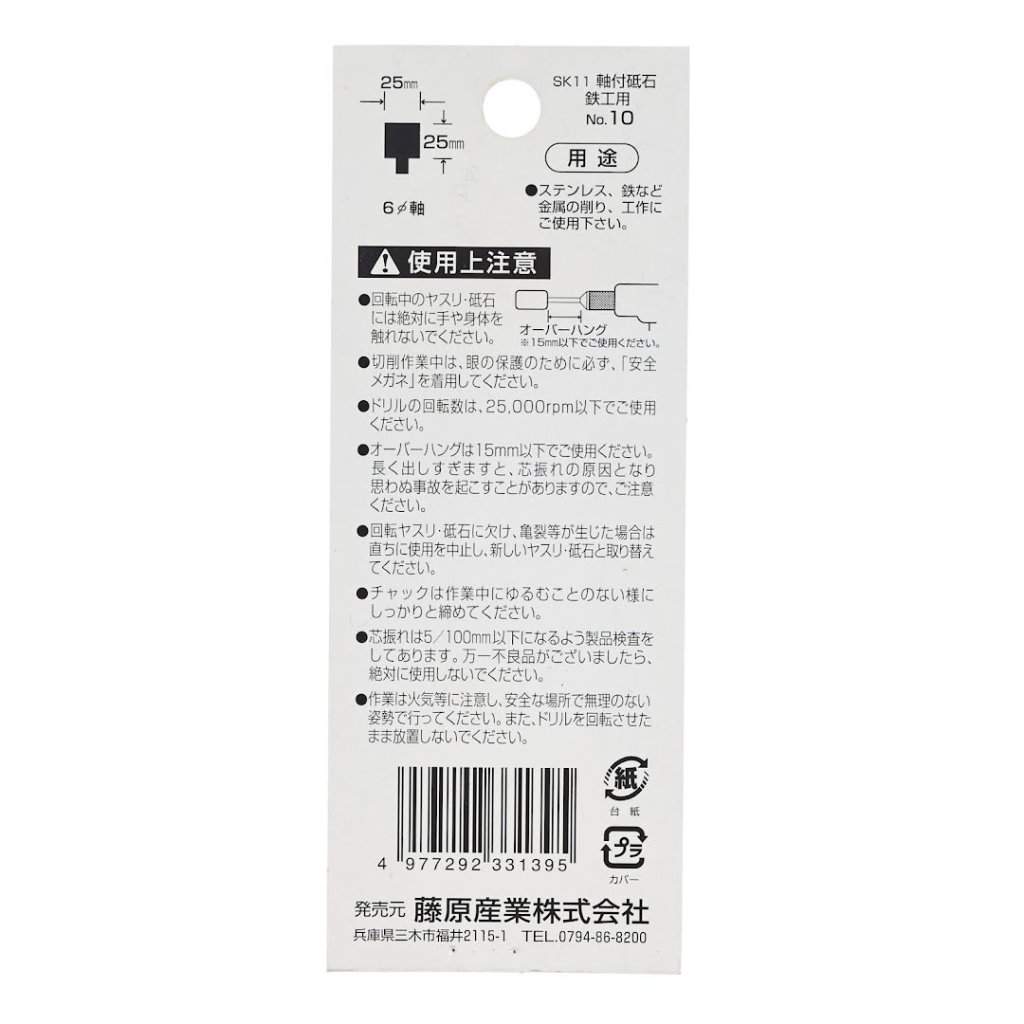 The SK11 Abrasive Stone Point No.10 is designed for precision metalworking on iron, light metals, and stainless steel. Ideal for use with electric drills and air grinders, this tool features a 6 mm shank diameter and a WA60P grit size for efficient material removal. Ensure an overhang of 15 mm or less and maintain drill speeds below 25000 RPM for optimal performance.