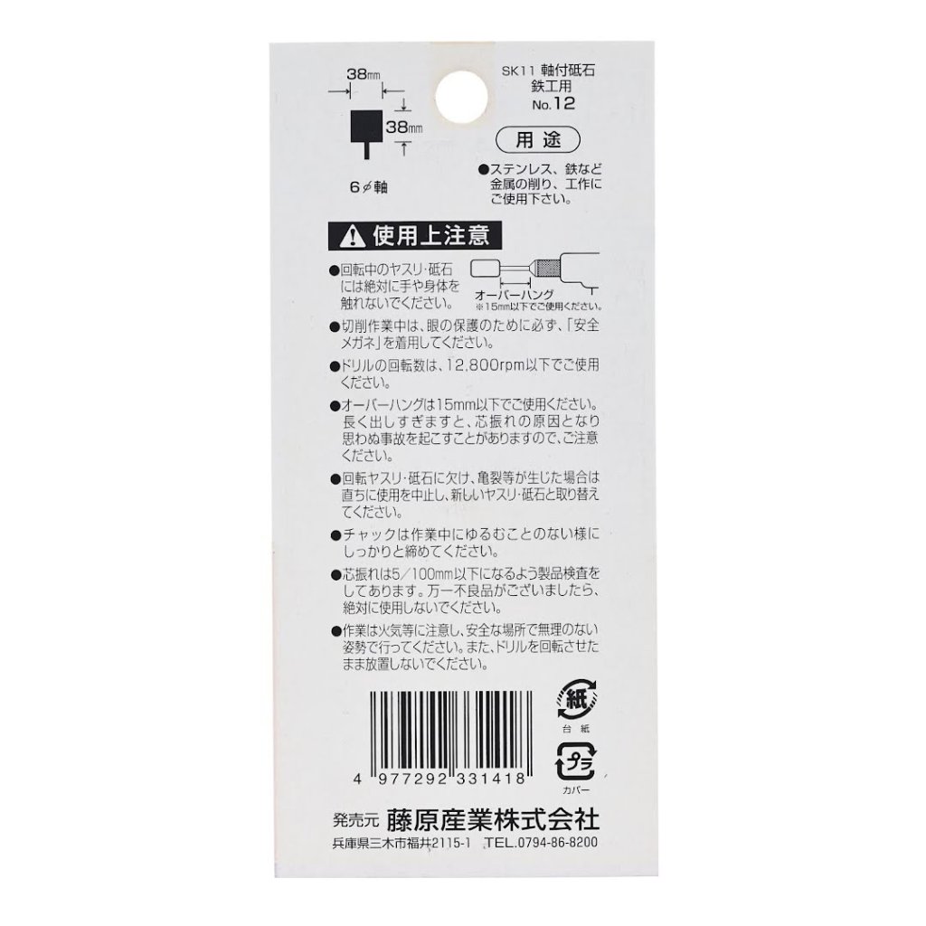 The SK11 Abrasive Stone Point No.12 is ideal for grinding and machining metals like iron and stainless steel. Designed for use with electric drills and air grinders, it features a 6 mm shank and a WA60P grit. The tool measures 37 mm in width and 73 mm in height, weighing 120 g. Ensure to use it with a drill speed under 12800 RPM.