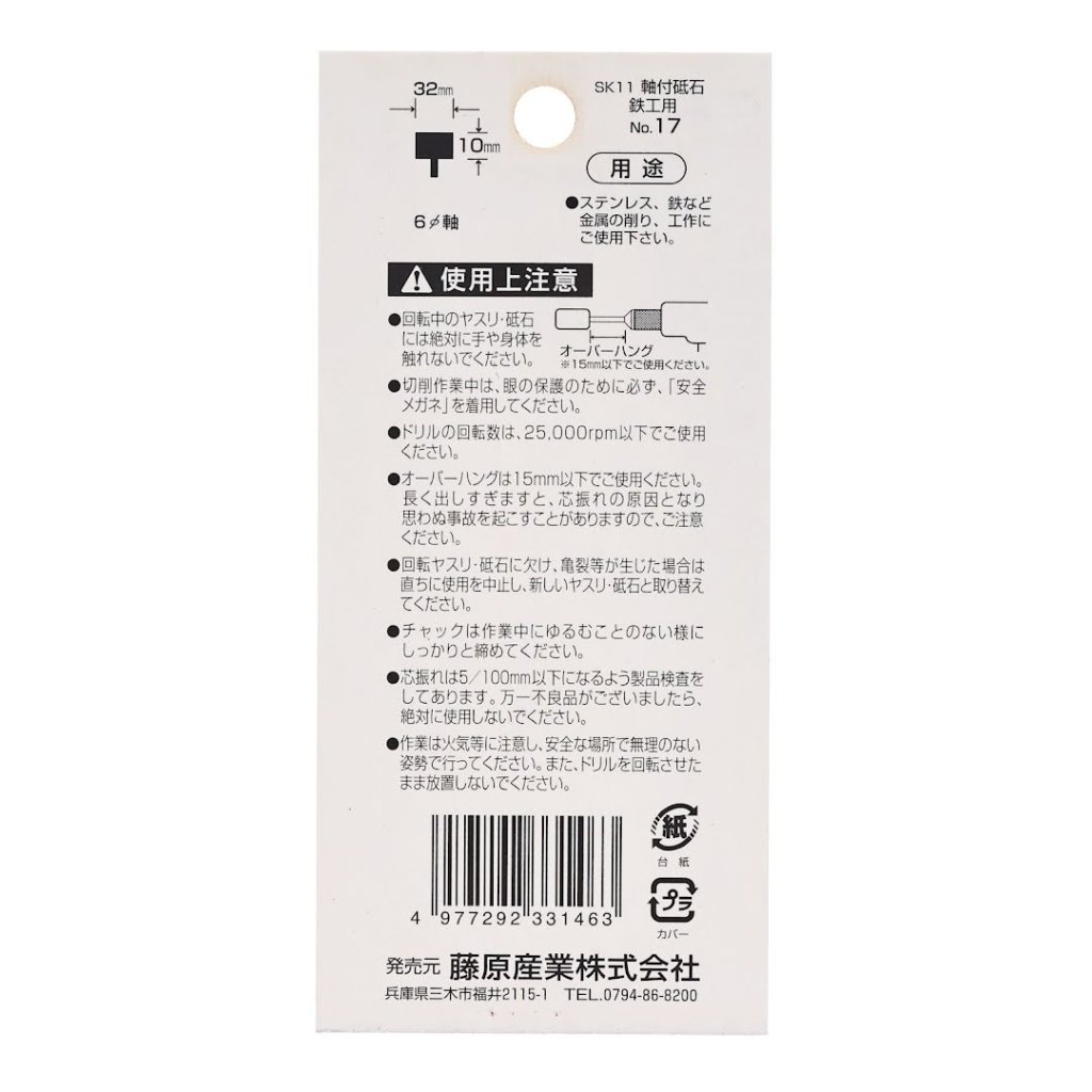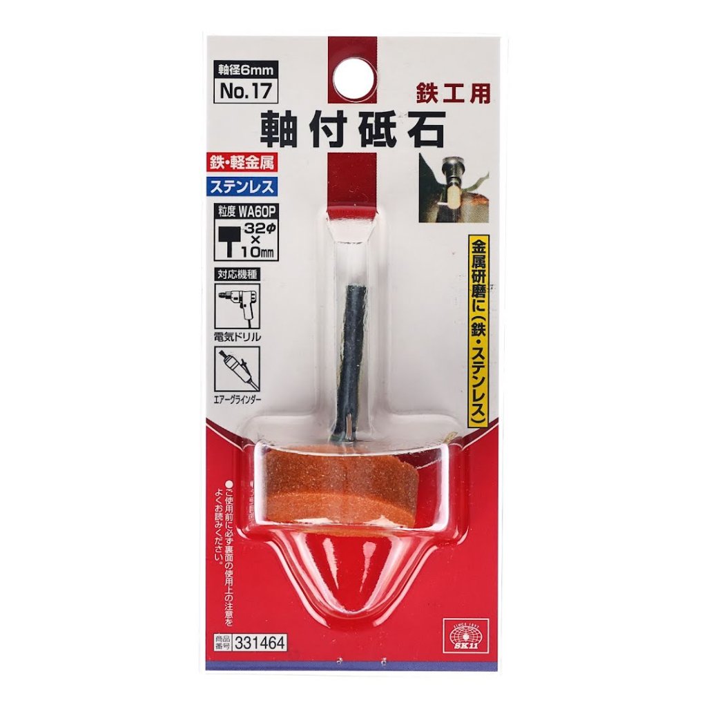 The SK11 Abrasive Stone Point No.17 is ideal for grinding and shaping various metals, including iron, light metals, and stainless steel. Designed for use with electric drills and air grinders, this tool features a shaft diameter of 6 mm and an abrasive width of 32 mm. Ensure proper use with a drill rotation speed below 25000 RPM and an overhang of 15 mm or less.