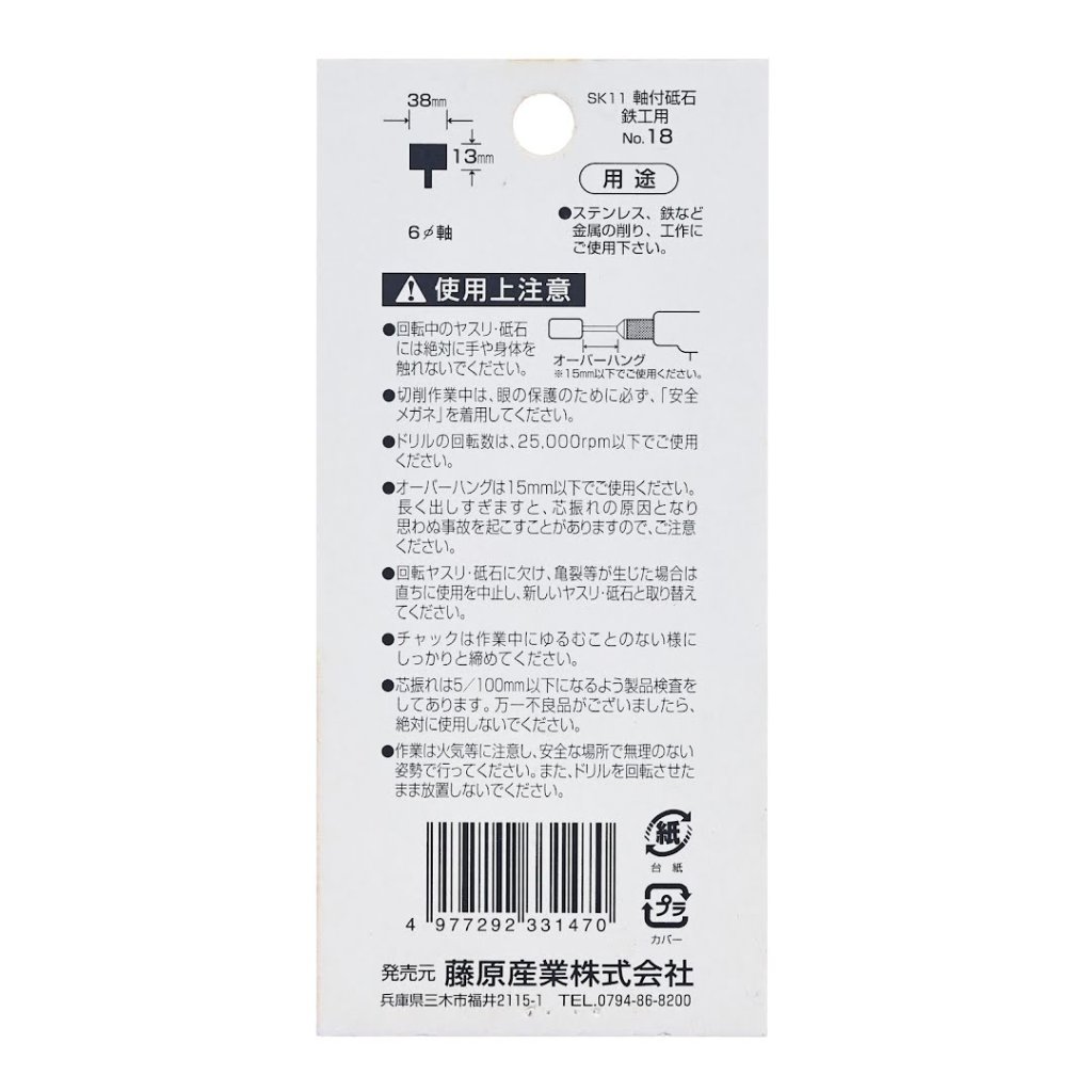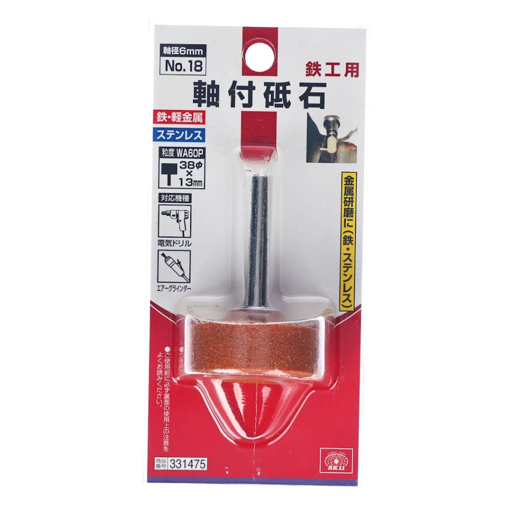 The SK11 Abrasive Stone Point No.18 is perfect for grinding and shaping various metals, including iron, light metals, and stainless steel. This versatile tool can be used with electric drills and air grinders, making it ideal for various metalworking tasks. The shank diameter is 6 mm, and the abrasive stone is 38 mm wide and 13 mm long. Ensure the drill's rotational speed does not exceed 25000 RPM for optimal performance.