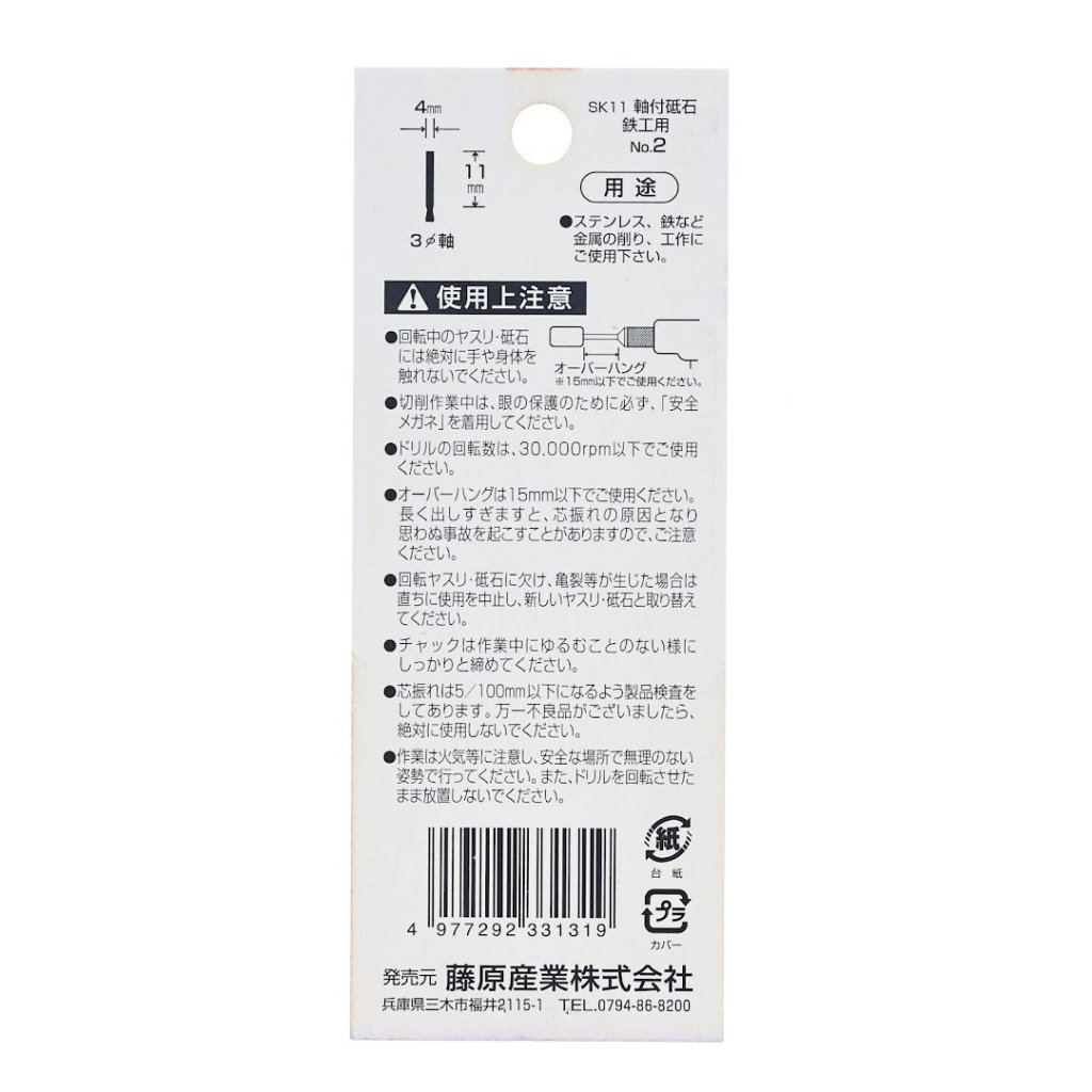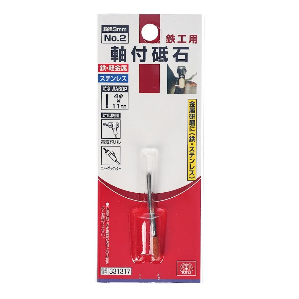 The SK11 Abrasive Stone Point No.2 is designed for grinding and shaping metals such as iron and stainless steel. This metalworking file is compatible with electric drills and air grinders, making it versatile for various metal-cutting tasks. With a shaft diameter of 3 mm and a grit size of WA60P, it ensures precise and efficient work. Use with an overhang of 15 mm or less and keep drill speeds below 30000 RPM for optimal performance.