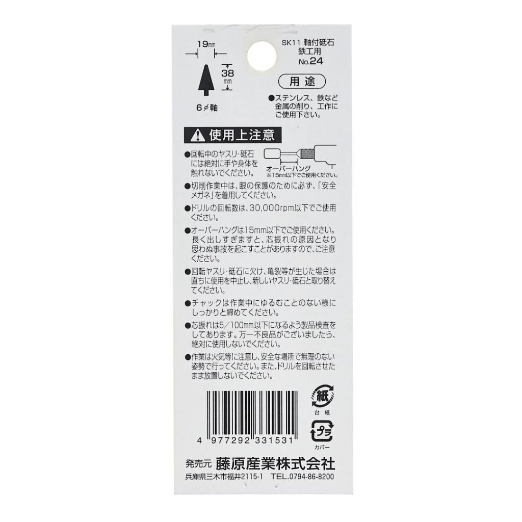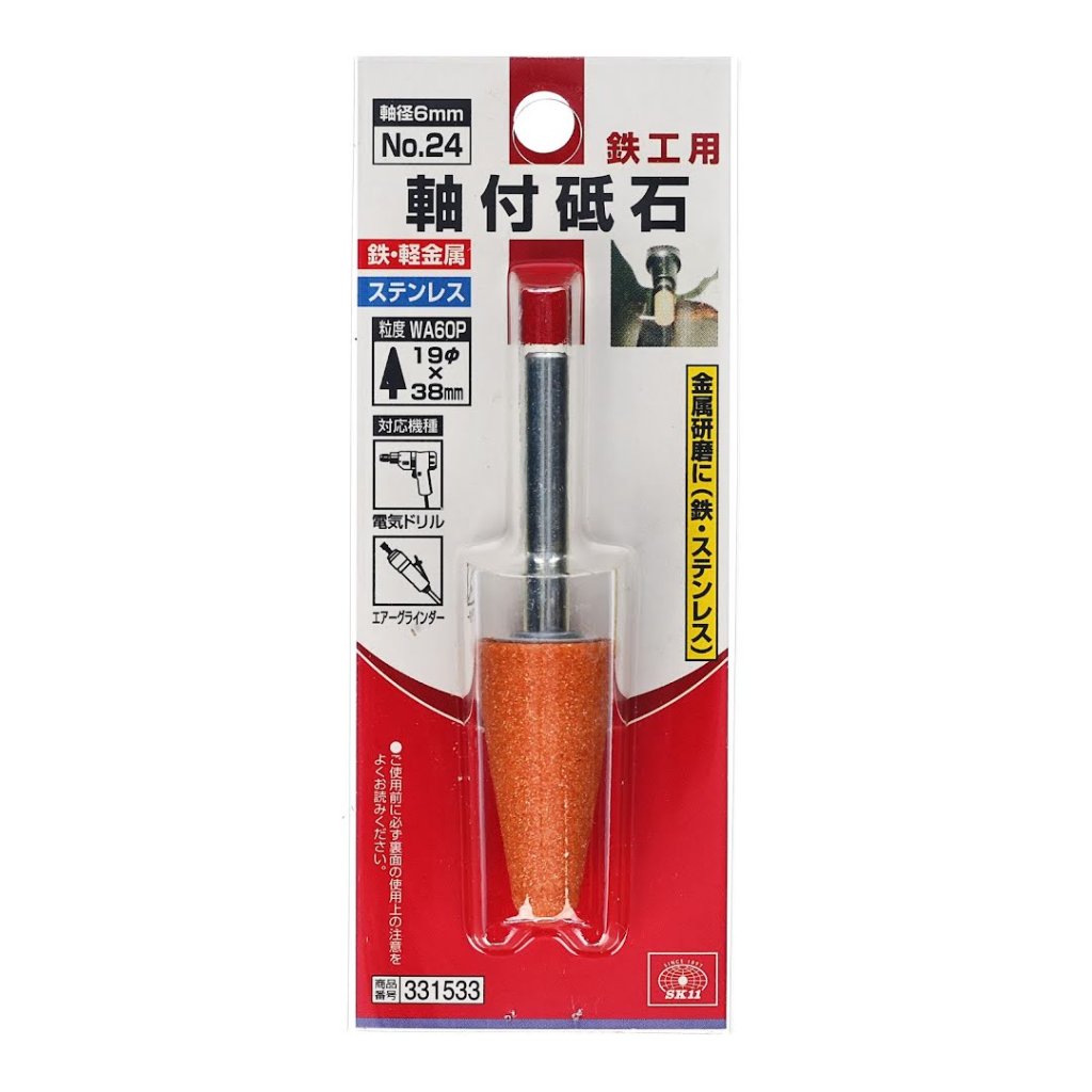 The SK11 Abrasive Stone Point No.24 is designed for cutting and shaping metals like iron, light metals, and stainless steel. This tool is ideal for electric drills and air grinders, featuring a 6 mm shank diameter and a stone width of 19 mm for precision work. For optimal performance, ensure an overhang of less than 15 mm and a drill speed under 30000 RPM.